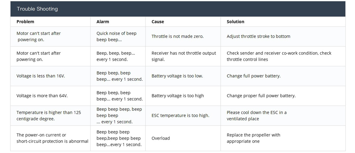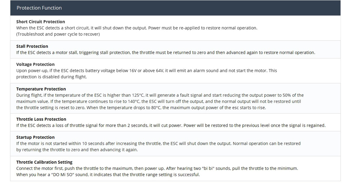 Throttle Pulse Width: Default 1050us-1940us, supports throttle calibration