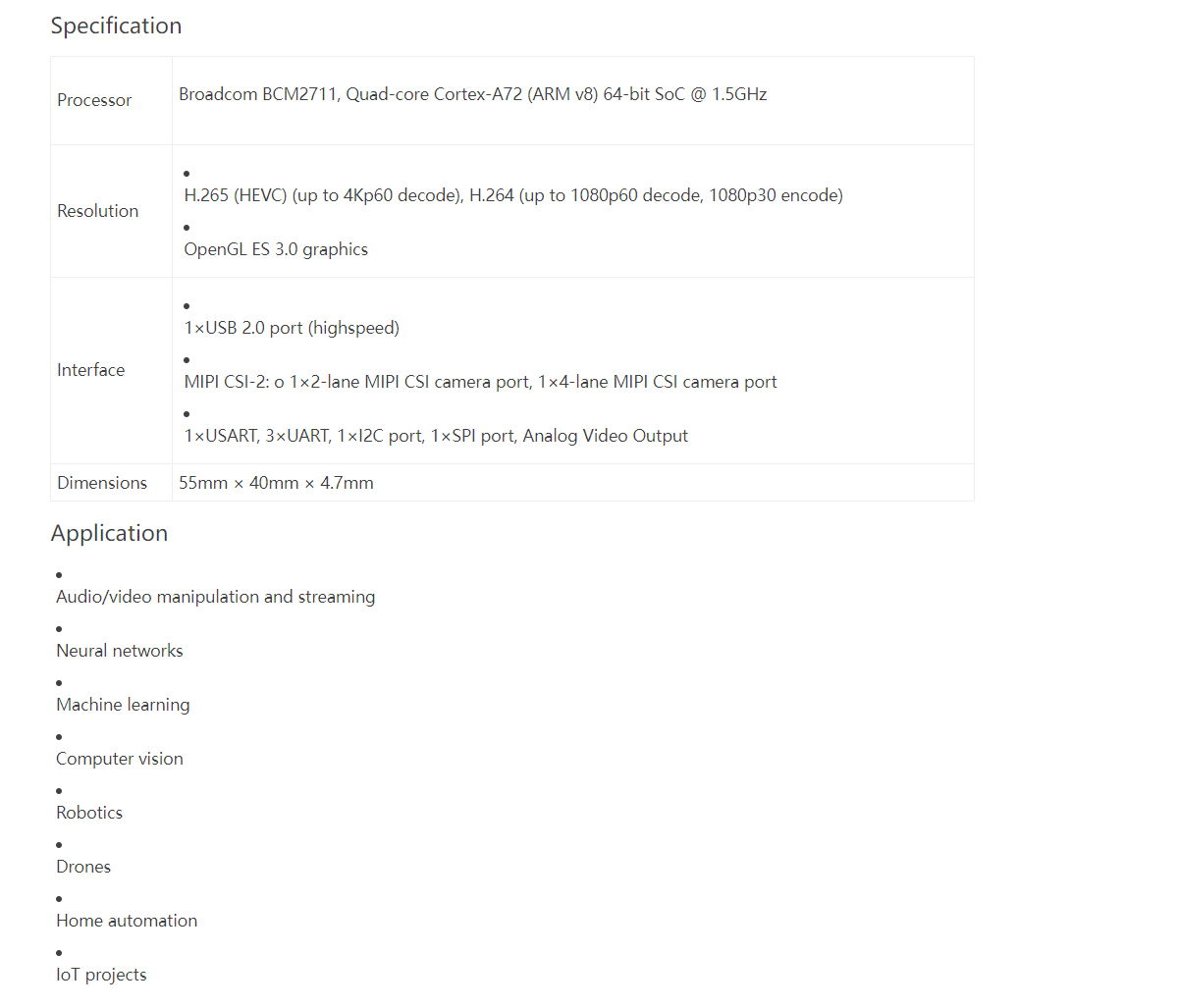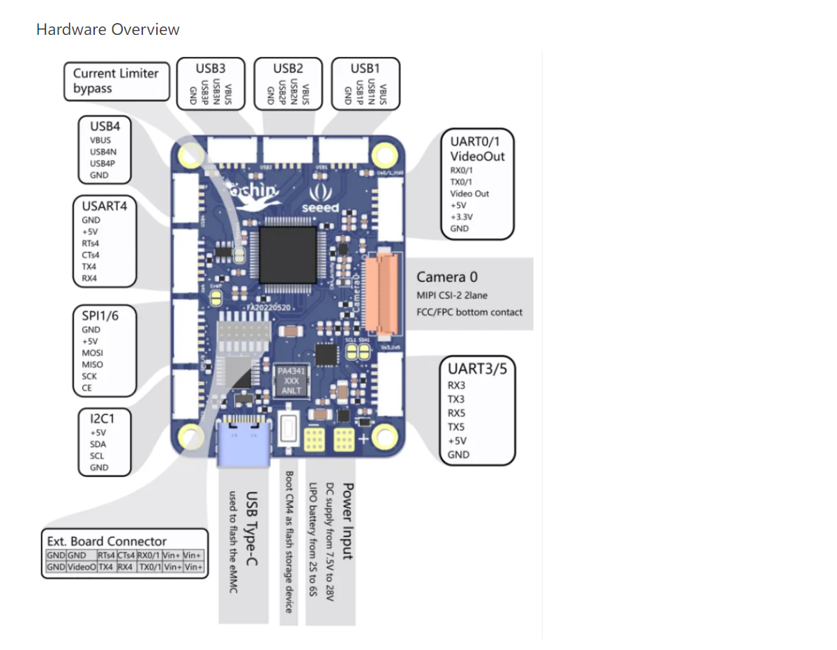 Interface: 1×USB 2.0 port (highspeed);MIPI CSI-2: o 1×2-lane MIPI CSI camera port, 1×4-lane MIPI CSI camera port;1×USART, 3×UART, 1×I2C port, 1×SPI port, Analog Video Output