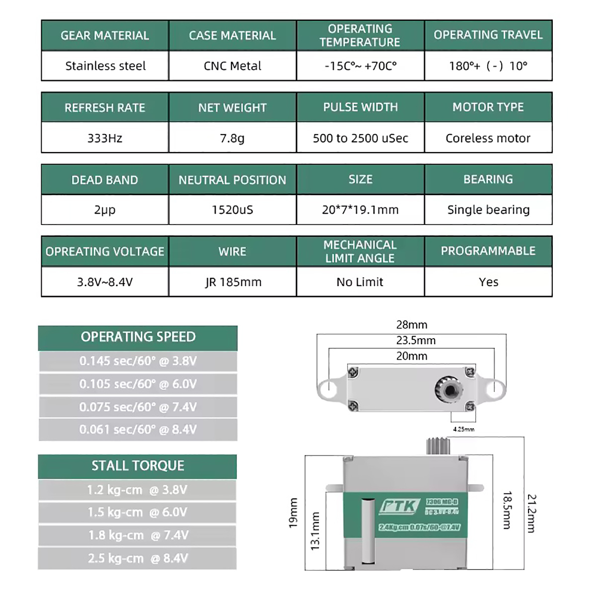 Speed/Stall Torque@ 8.4V: 0.061sec / 60° 2.5 Kg.cm