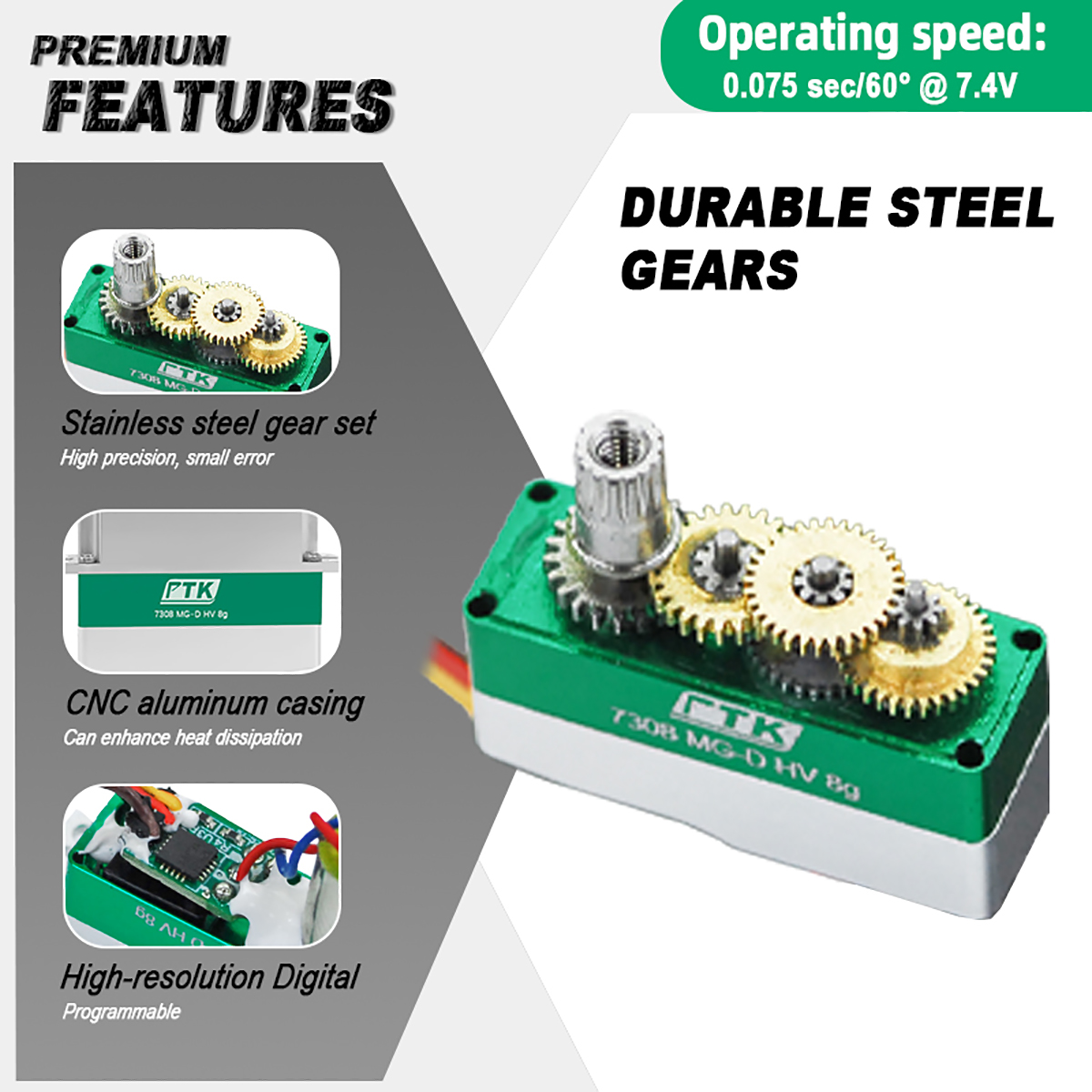 Fast and precise: The PTK 7308MG-D servo provides quick response and accurate positioning for smooth and precise control.
