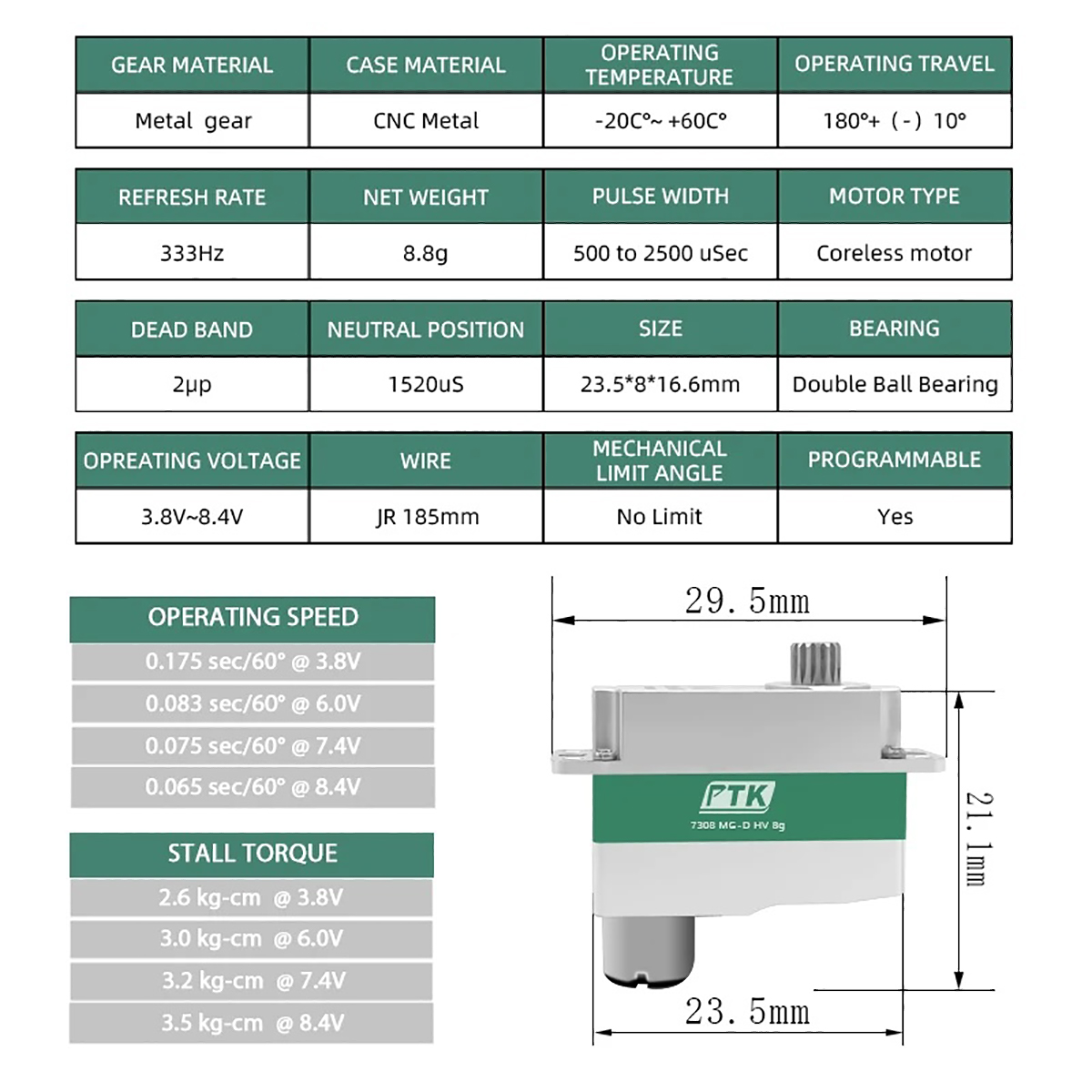 Speed/Stall Torque@ 8.4V: 0.065sec / 60° 3.5 Kg.cm