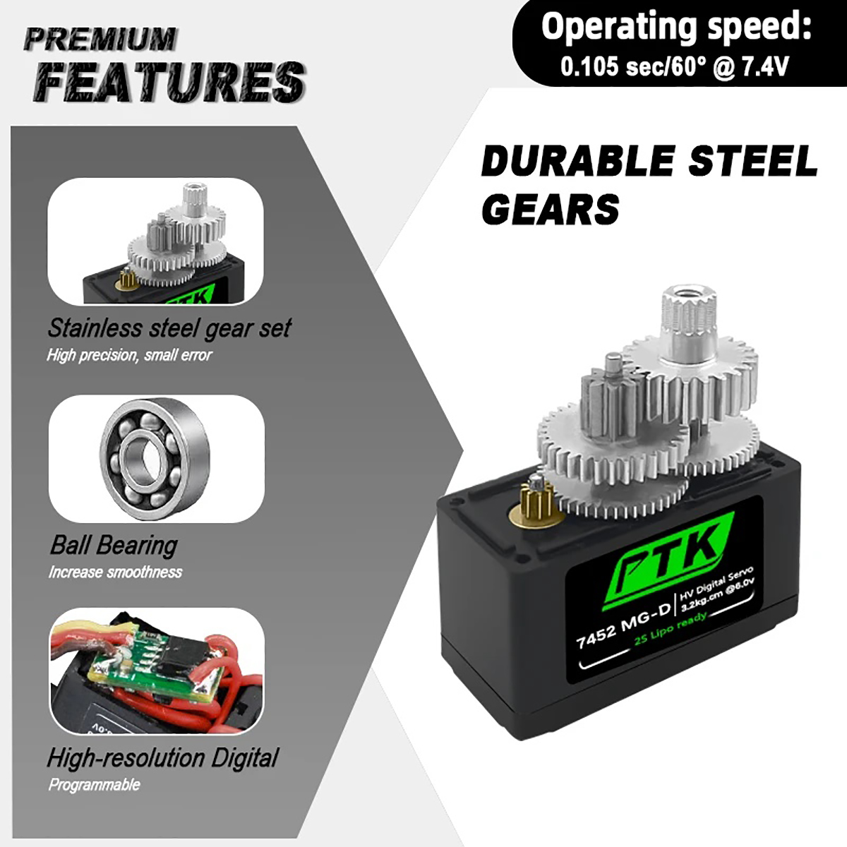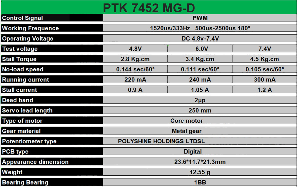 Speed/Stall Torque@ 7.4V: 0.105 sec/60° 4.5kg.cm