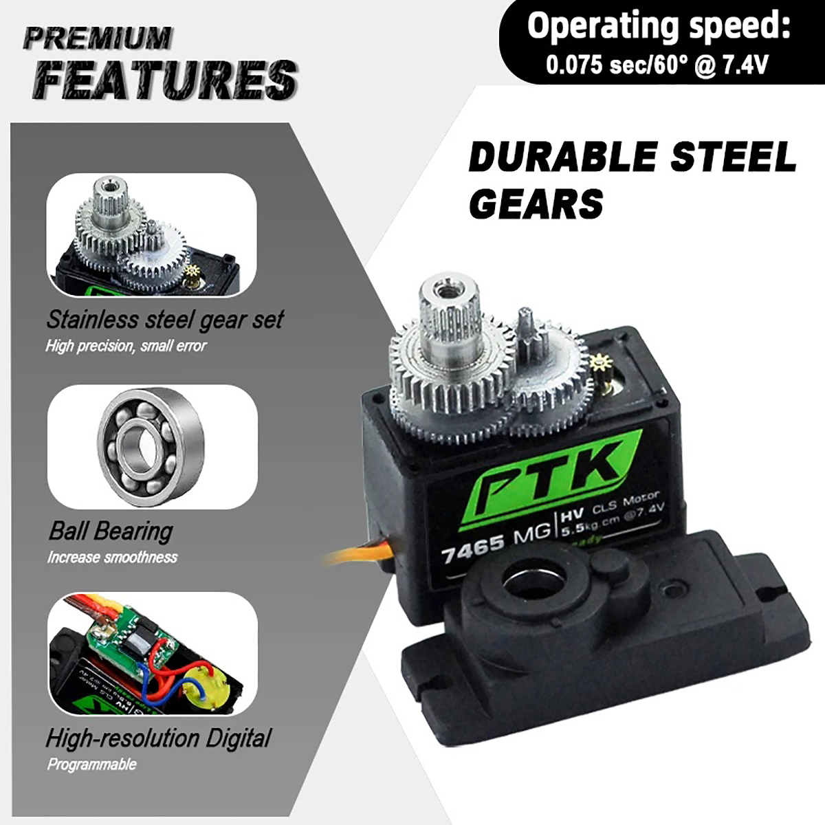 Speed/Stall Torque@ 7.4V: 0.075 sec/60° 5.5kg.cm