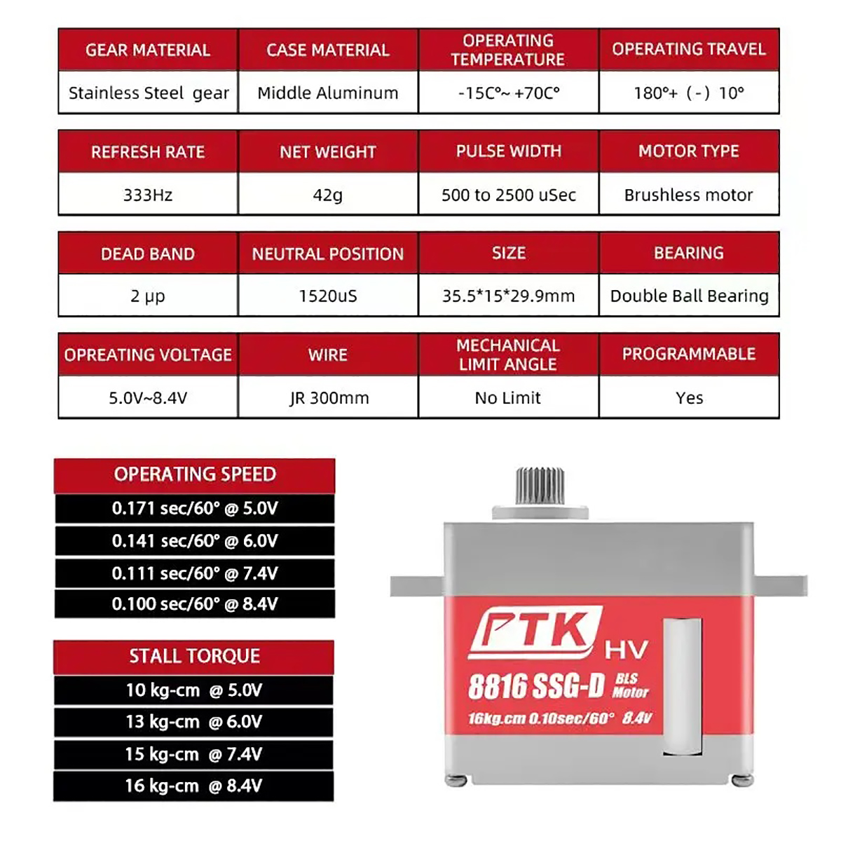 Speed/Stall Torque@ 8.4V: 16kg.cm – 0.100sec/60°