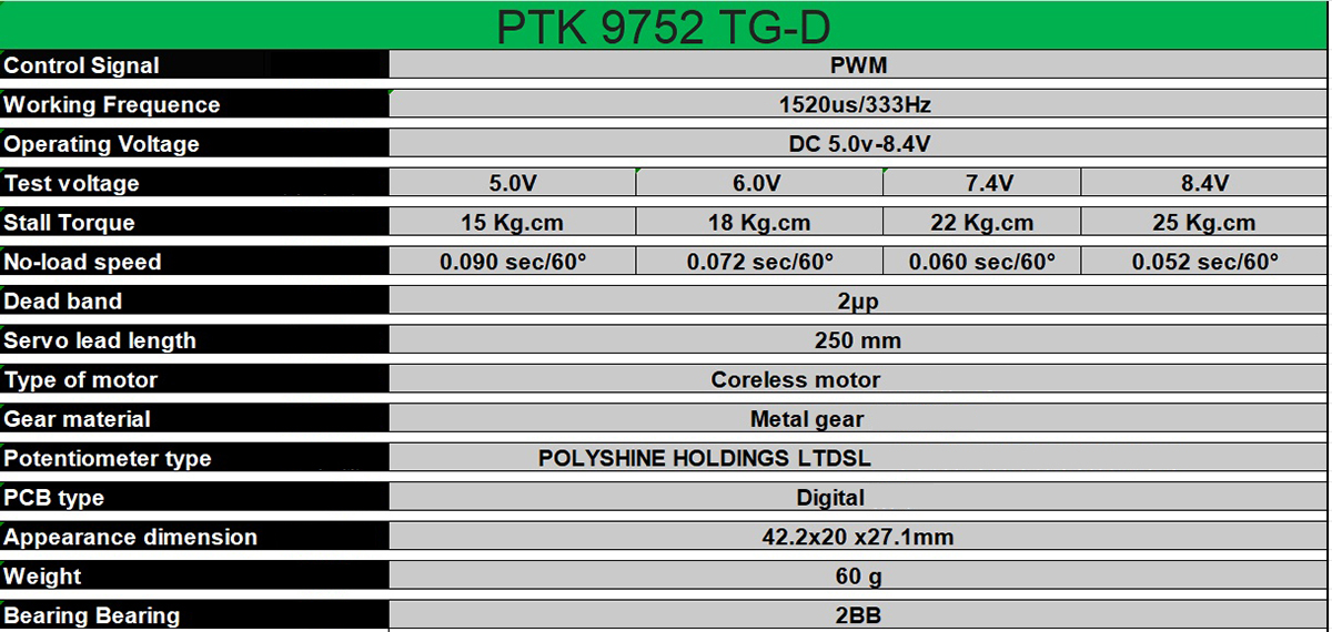 Speed Stall Torque@ 8.4V: 25kg.cm – 0.052sec/60°