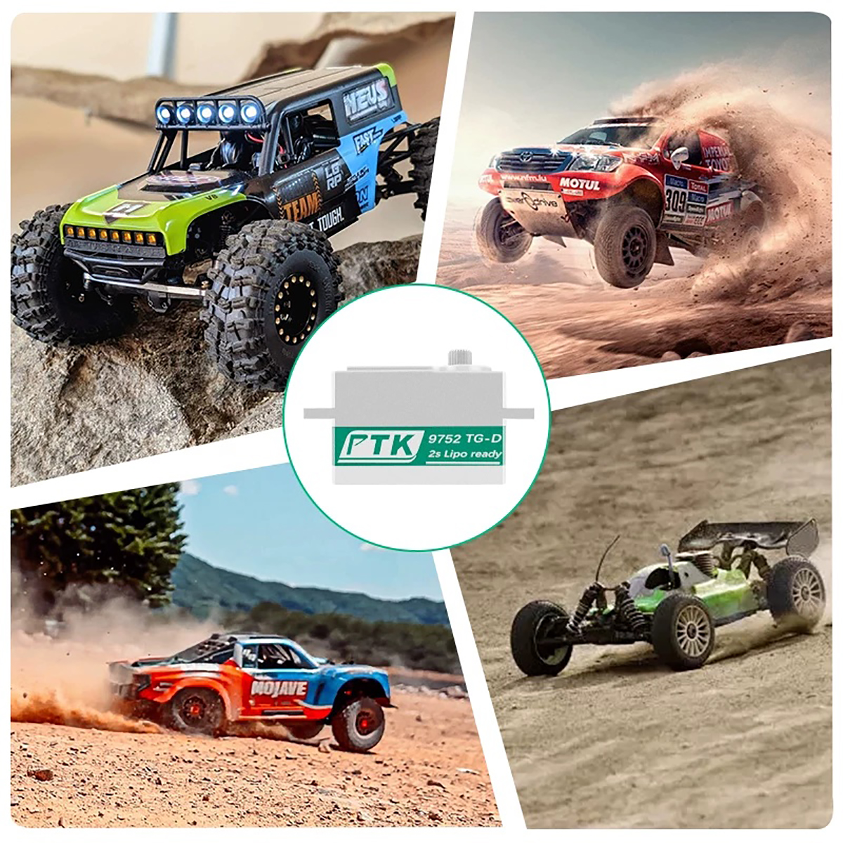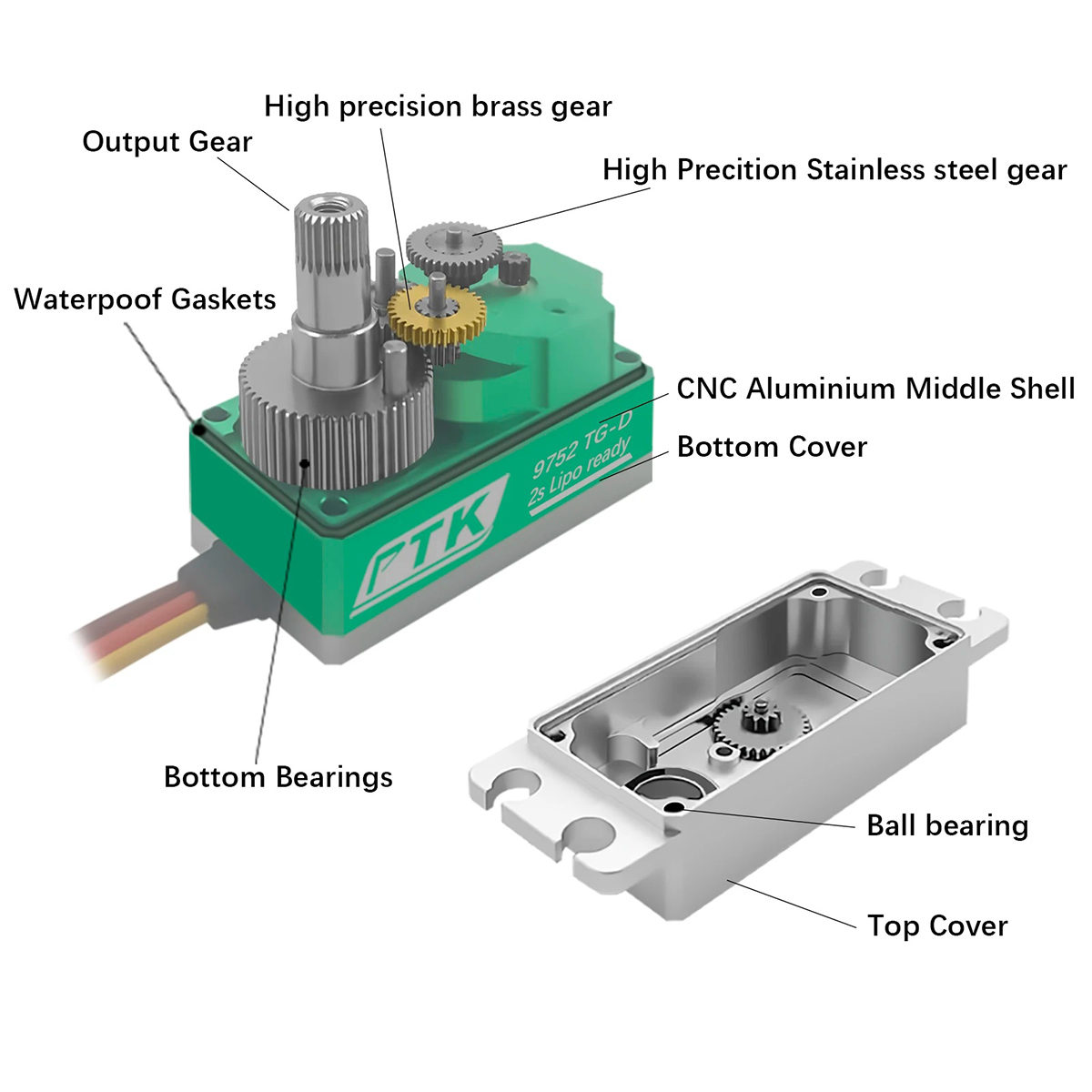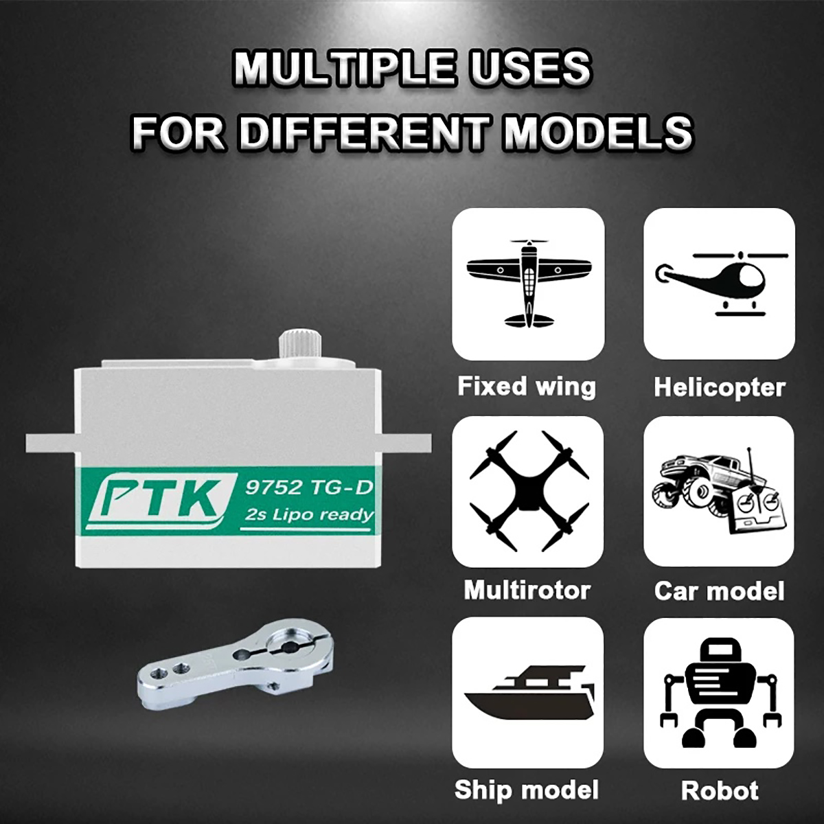 Titanium-plated gears; dual-bearing design; water-resistant design. Full metal shell. Thickened and reinforced arm! Suitable for 1/10 & 1/8 RC cars, on-road cars, and drift cars. Beyond the appearance upgrade, the PTK 9752TG-D low-profile servo also excels in performance. With high-torque output at 8.4V, it can respond to various control signals quickly and accurately, providing precise and reliable steering control for your model or device.