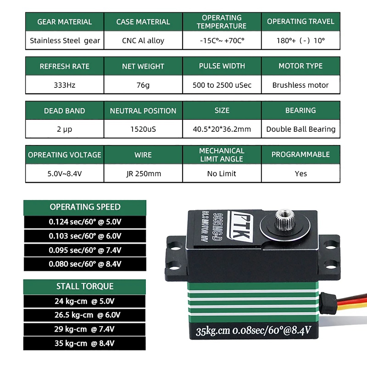 Speed Stall Torque@ 8.4V: 36kg.cm – 0.074 sec/60°