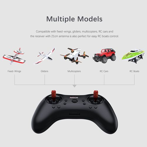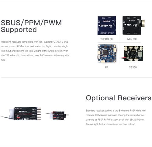 Compatible with fixed-wings, Gliders, multicopters, RC cars and boats. T8S can use with R6FG,R6F, R7FG, R8EF, R8FM mini receiver.