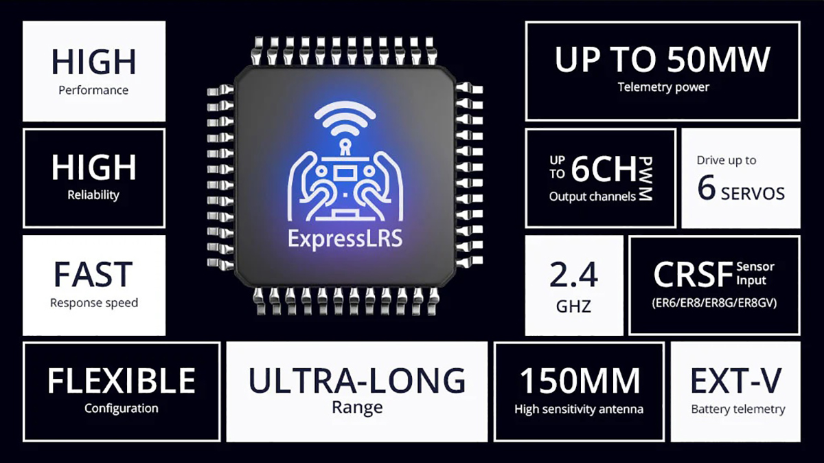 Compatible with all 2.4GHz ExpressLRS modules and transmitters with built in 2.4GHz ExpressLRSReceiver