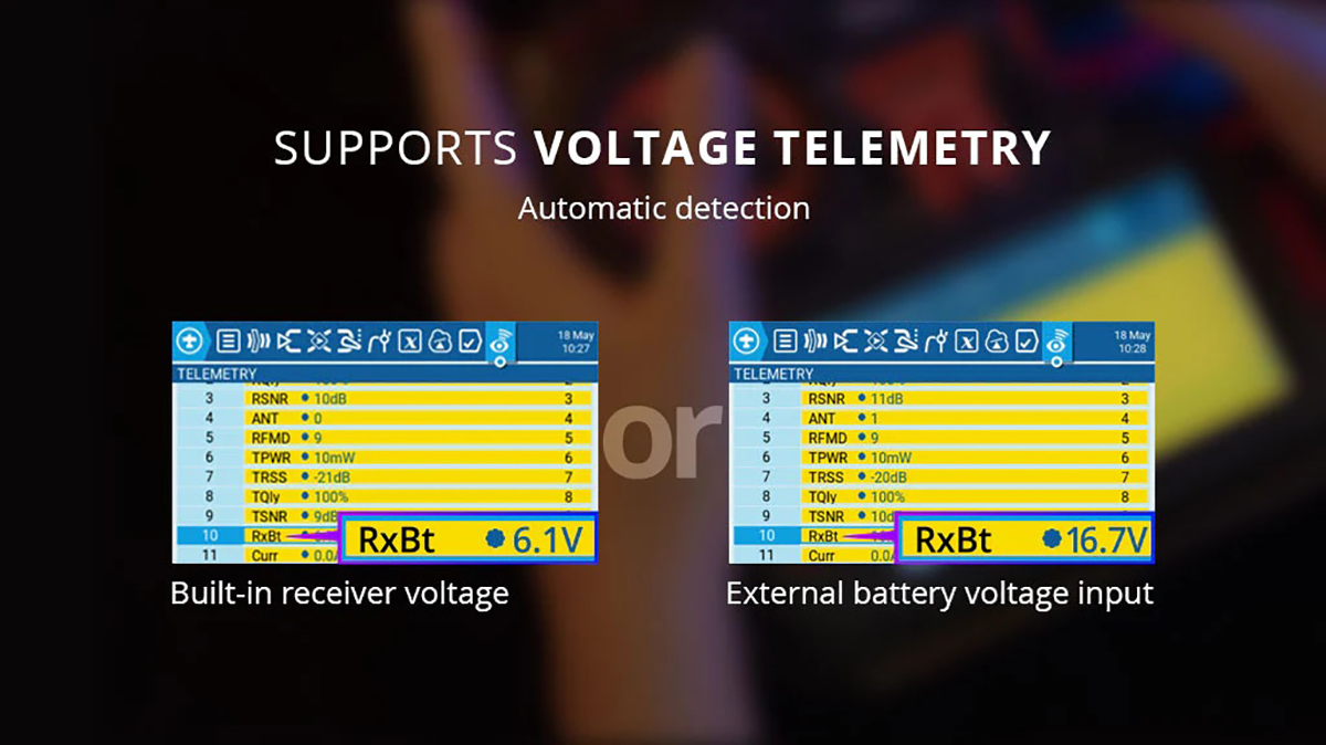 Automatically voltage telemetry of external battery voltage or built-in receiver voltage