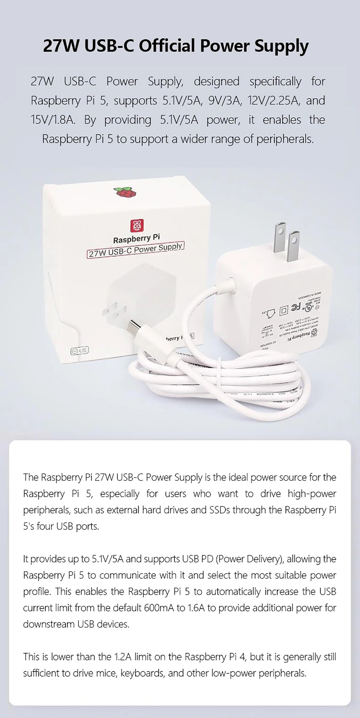 The Raspberry Pi 27W USB-C PD (Power Delivery) Power Supply will deliver a maximum of 5.1V, 5A enabling the Raspberry Pi 5 to power a wider range of peripherals. The total power drawn from the four USB ports on Raspberry Pi 5 is limited by default to a nominal 600mA; this limit is automatically increased to a nominal 1.6A when the USB-C PD Power Supply is detected.