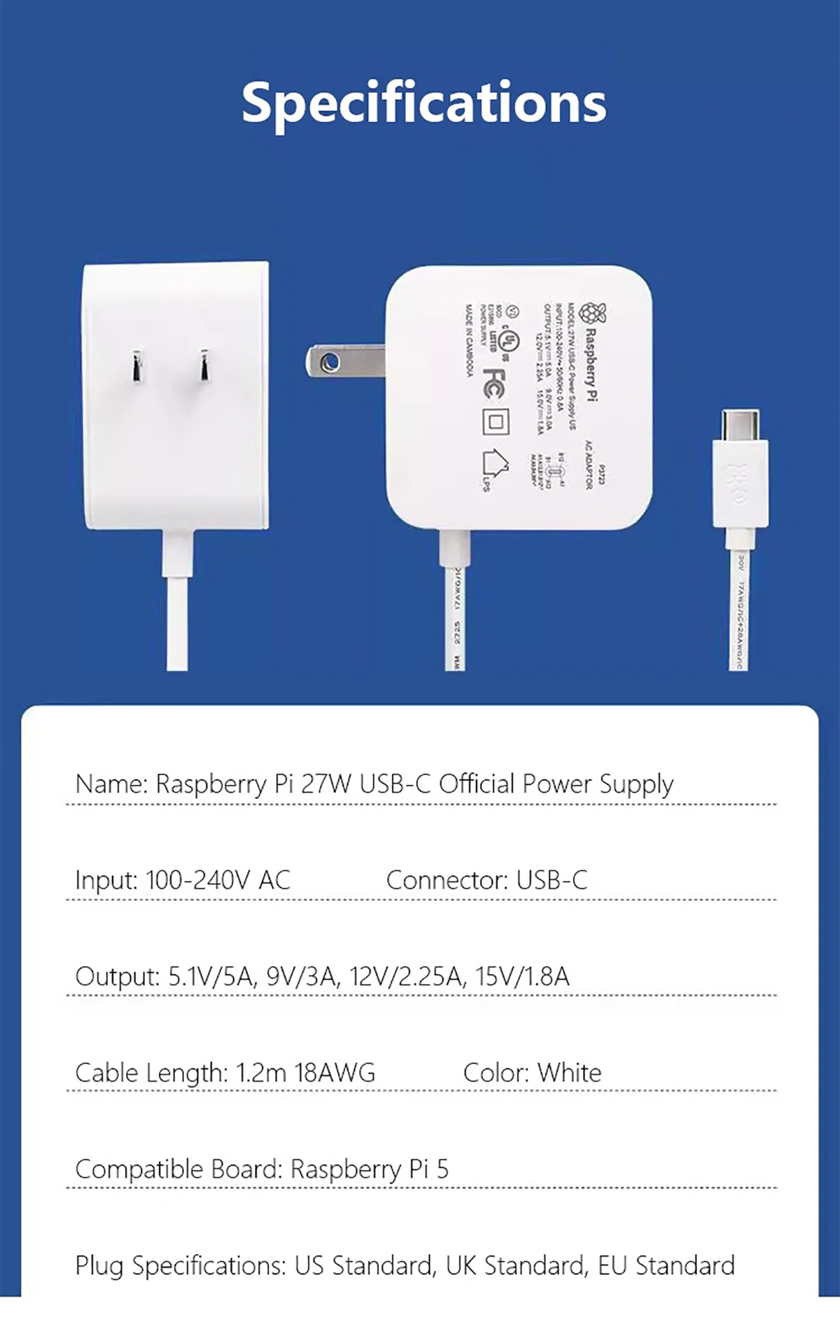 The USB-C PD Power Supply is also capable of delivering 3A @ 9V, 2.25A @ 12V, and 1.8A @ 15V to PD-compatible products, making it a good cost-effective power supply for many general-purpose, non-Raspberry Pi use cases.