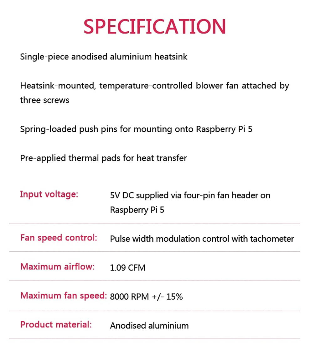 Input voltage: 5V DC supplied via four-pin fan header on Raspberry Pi 5