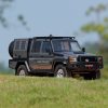 “Land Commander” features an integrally formed straight axle with a caster angle kingpin. Its front CVD utilizes a triple ball joint connection design (commonly referred to a triple ball joint driveshaft), significantly improving steering smoothness at large angles. Land Commander is configurated with a two-speed transmission and a dig unit reduction gearbox system, and the dig function offers rear axle locking, allowing freely switching between front-wheel drive and four-wheel drive modes, resulting in an extremely small turning radius. Its reverse rotation transmission effectively reduces axle effect, delivering a more stable experience and perfect driving posture. Land Commander adopts a realistic pickup truck style, and the body uses a 1.5mm thick PC material and fills with abundant internal details. It comes factory-equipped with movable extended rear truck dorr, a roof rack, and a spare tire, allowing players to mix and match from their preference to assemble their own customized vehicle. To meet heavy-duty off-roading needs, “Land Commander” comes standard with a functional winch hook, a rear suspension combining leaf springs with oil-filled shock absorbers, and a multi-mode LED light system. In terms of electronics, it is equipped with a 10-channel 2.4G remote control, six built-in high-voltage metal-gear servos along and a “Hobbywing” 60A crawler-specific ESC, offering exceptional value and ensuring the player enjoy great fun and experience upon unboxing.