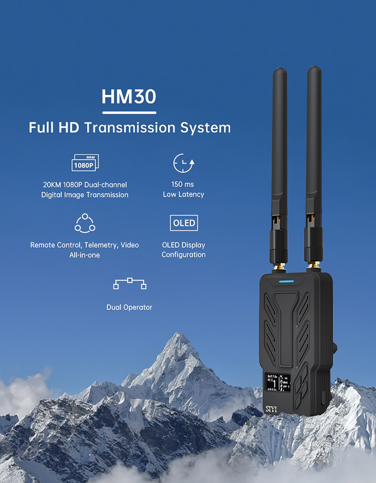 HM30 is a 30KM level 150ms low latency 1080p full HD video link based onthe latest image transmission technology which is independently developedby SIYI Technology . Abundant features and powerful performance make it a commonly applied device of reliable FPV view and solid control on FPV planes , commercial drones , unmanned vehicles and boats , and robotics。