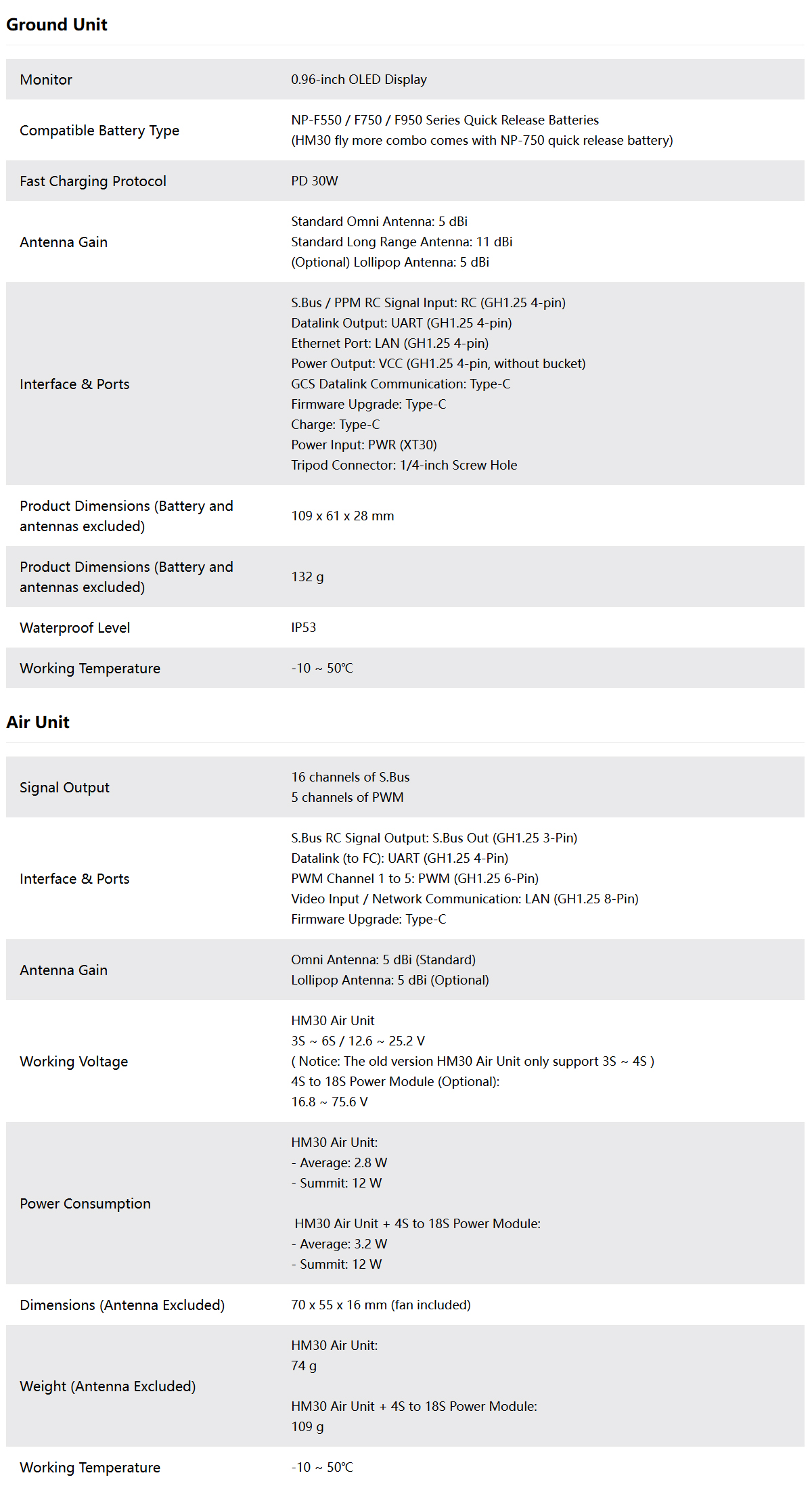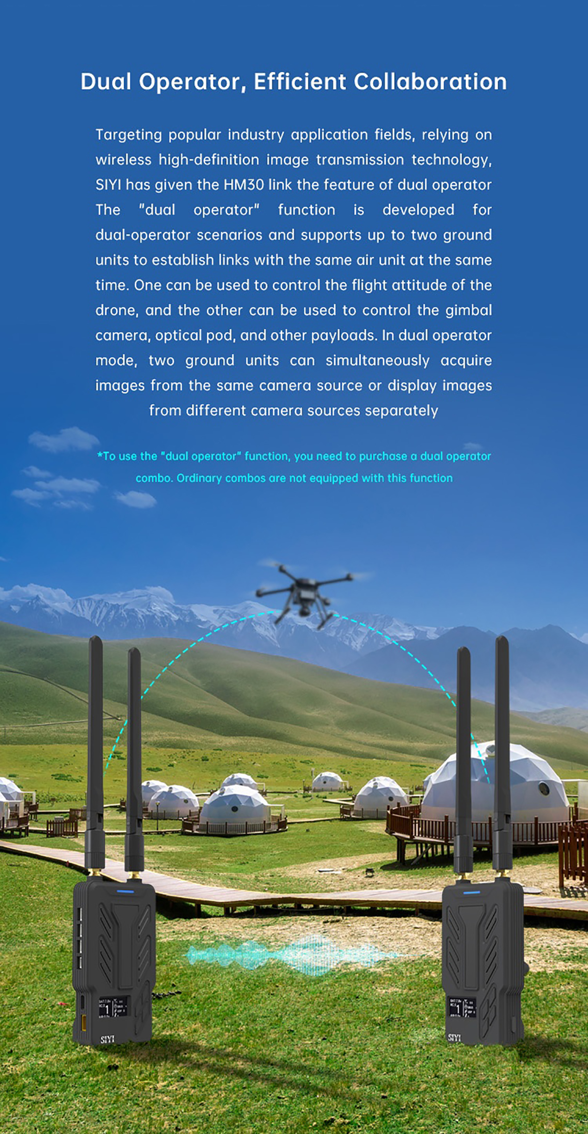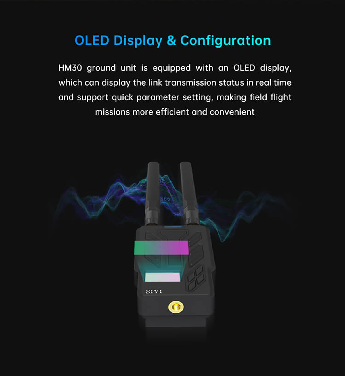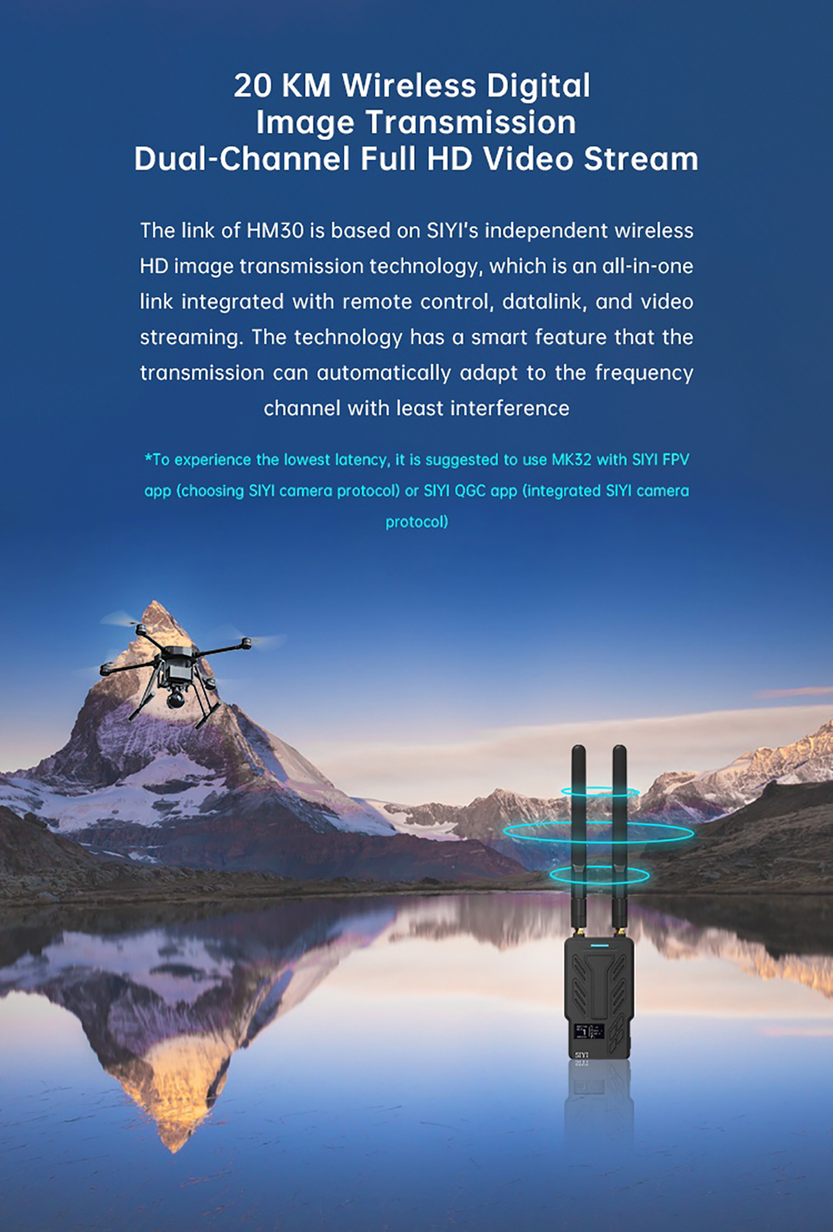 HM30 applies SlYI’s brand new and cutting-edge high-definition image transmission technology with the ability to transmit 1080p 60fps video stream at ” 150ms low latency. The technology comes with a smart feature to adapt its transmission toequency bands with the least interference. Equipped with the standard omni-directional antennas . HM30’s effectivcan reach up to 15 kilometers. With the long-range antennas , the range can be up to 30 kilometers with full HDimage transmission , real-time telemetry , and stable control.