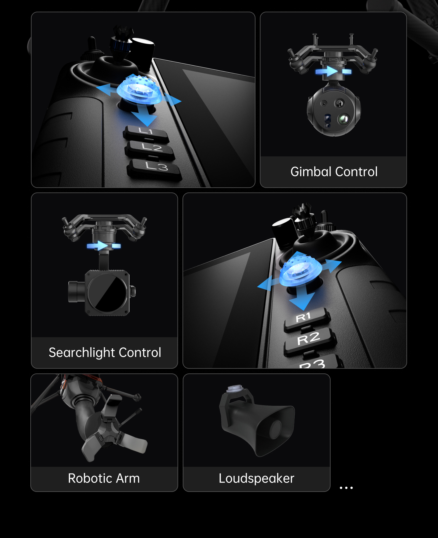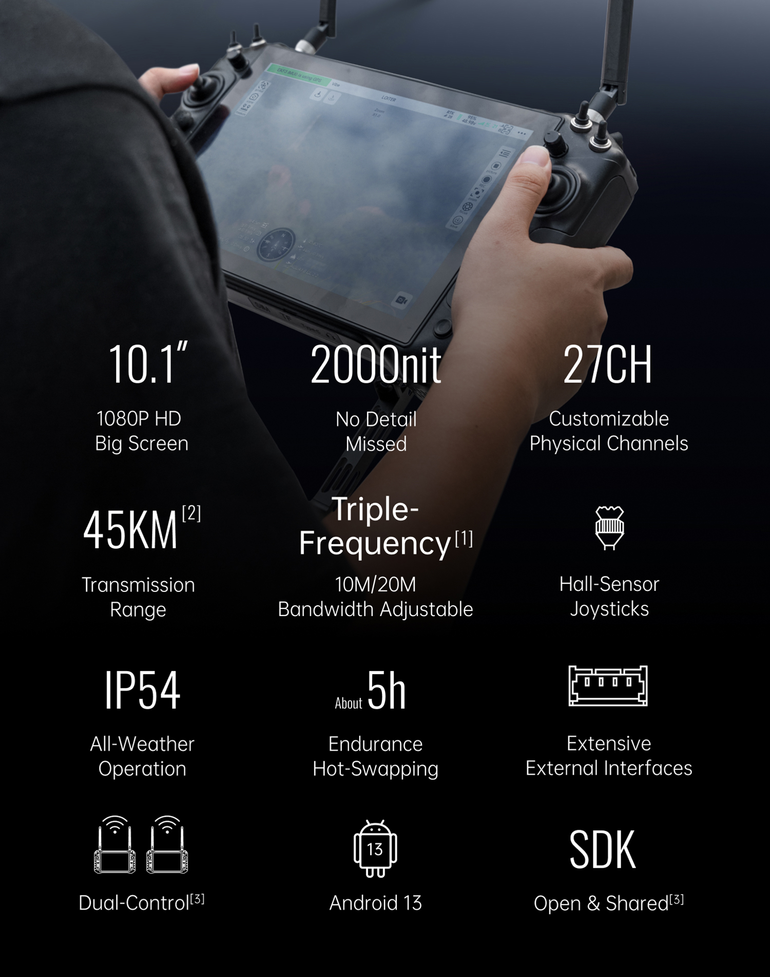 Multi-Channel High-Precision Control:27 customizable physical channels, paired with Hall sensor joysticks + dual mini-sticks, enabling two-handed parallel control of multiple payloads