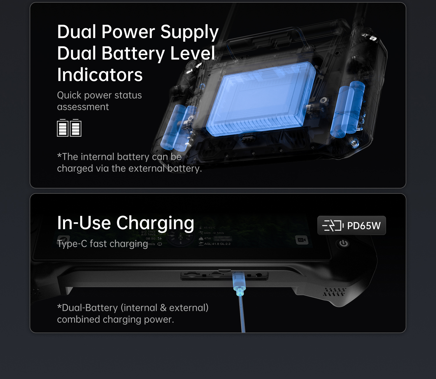 Hot-Swappable Battery, Non-Stop Operation:Dual-battery design, supports external battery hot-swapping + 65W PD fast charging, no anxiety for long outdoor operations