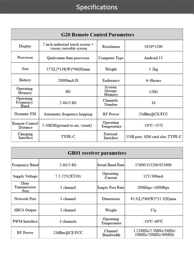 Be the first to review “Skydroid G20 Remote Controller with GR01 Receiver 2.4GHz/5.8GHz Dual Band 30KM Image Transmission”