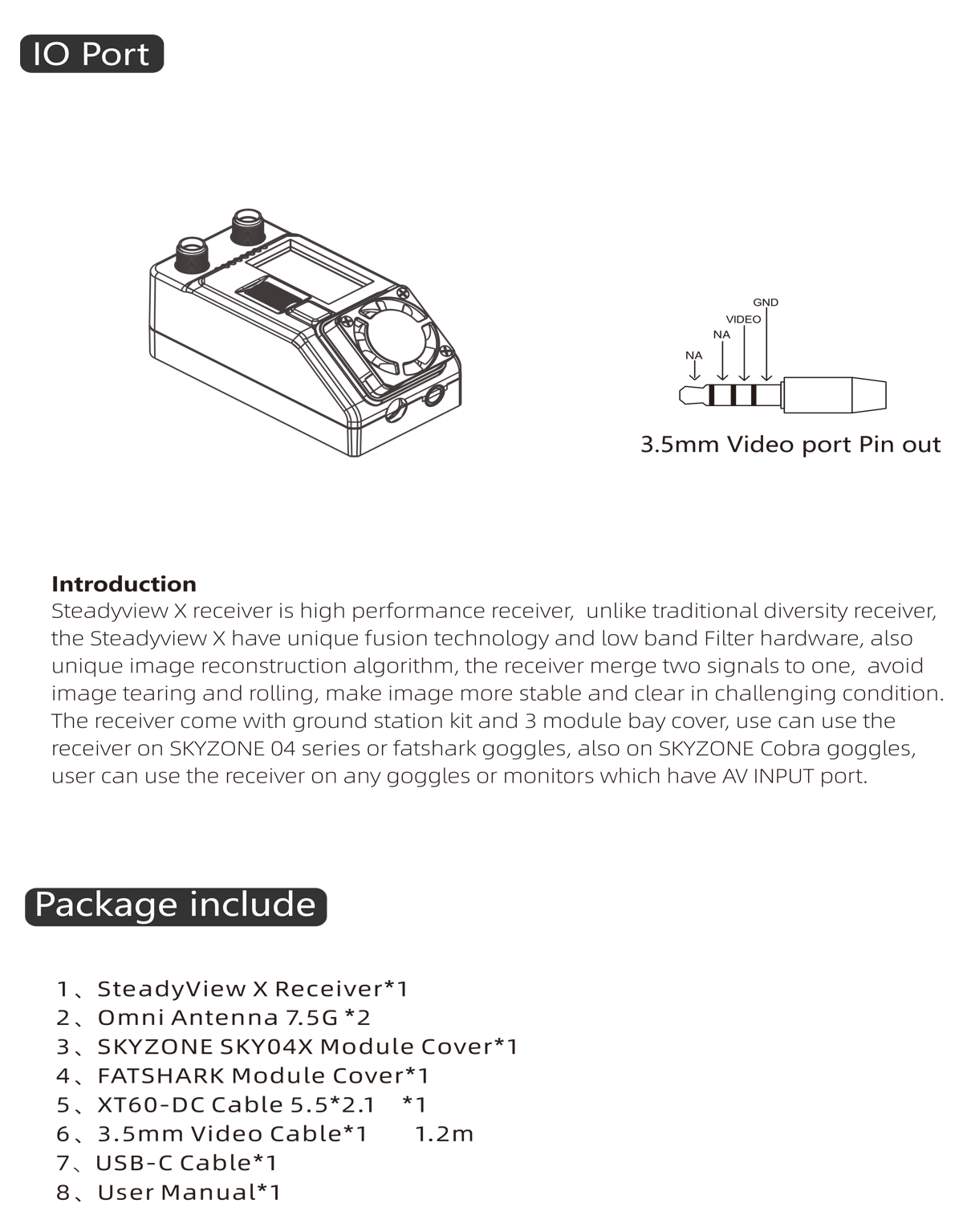 The receiver come with ground station kit and 3 module bay cover, use can use the receiver on SKYZONE 04 series or fatshark goggles, also on SKYZONE Cobra goggles, user can use the receiver on any goggles or monitors which have AV INPUT port.