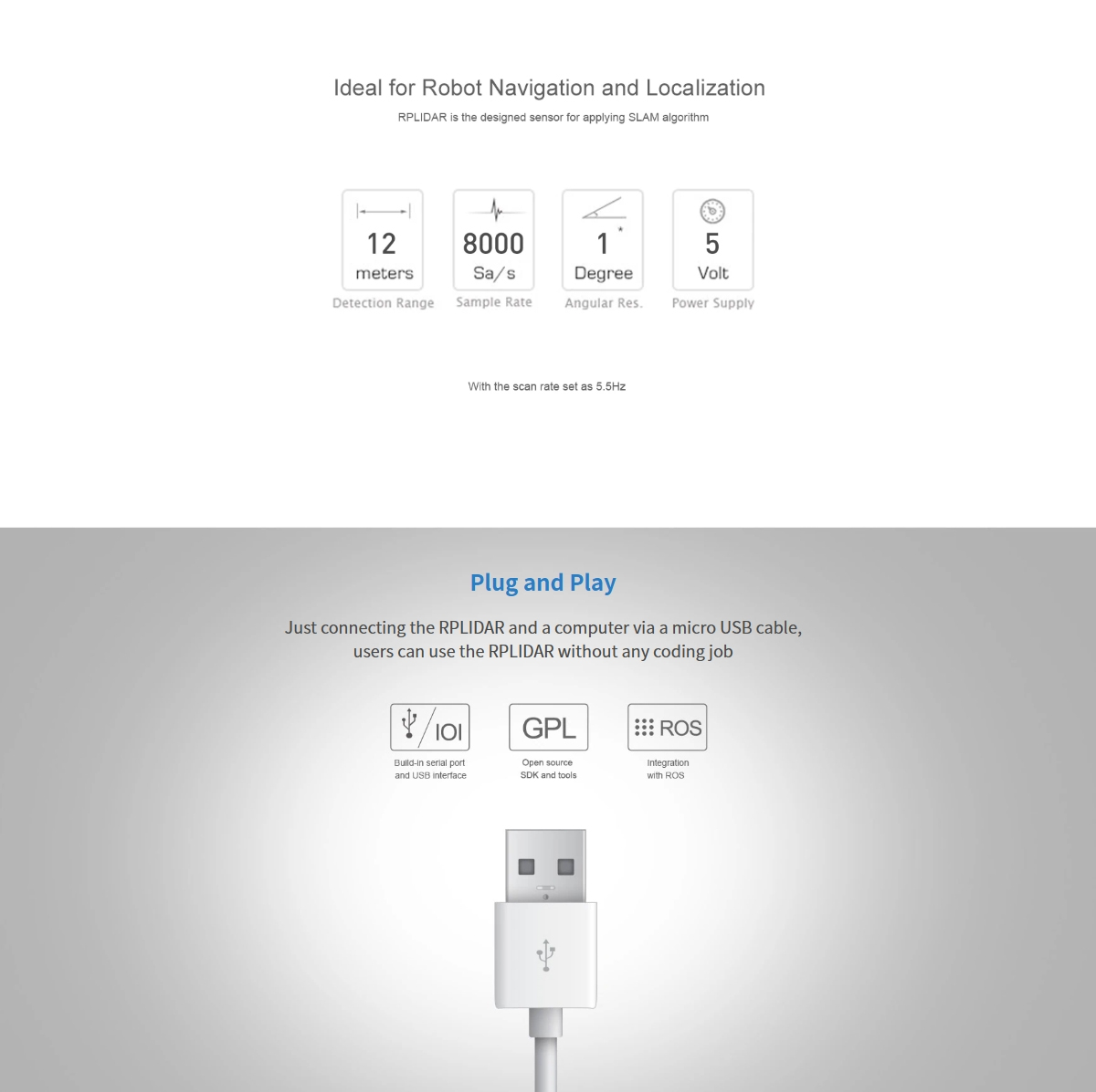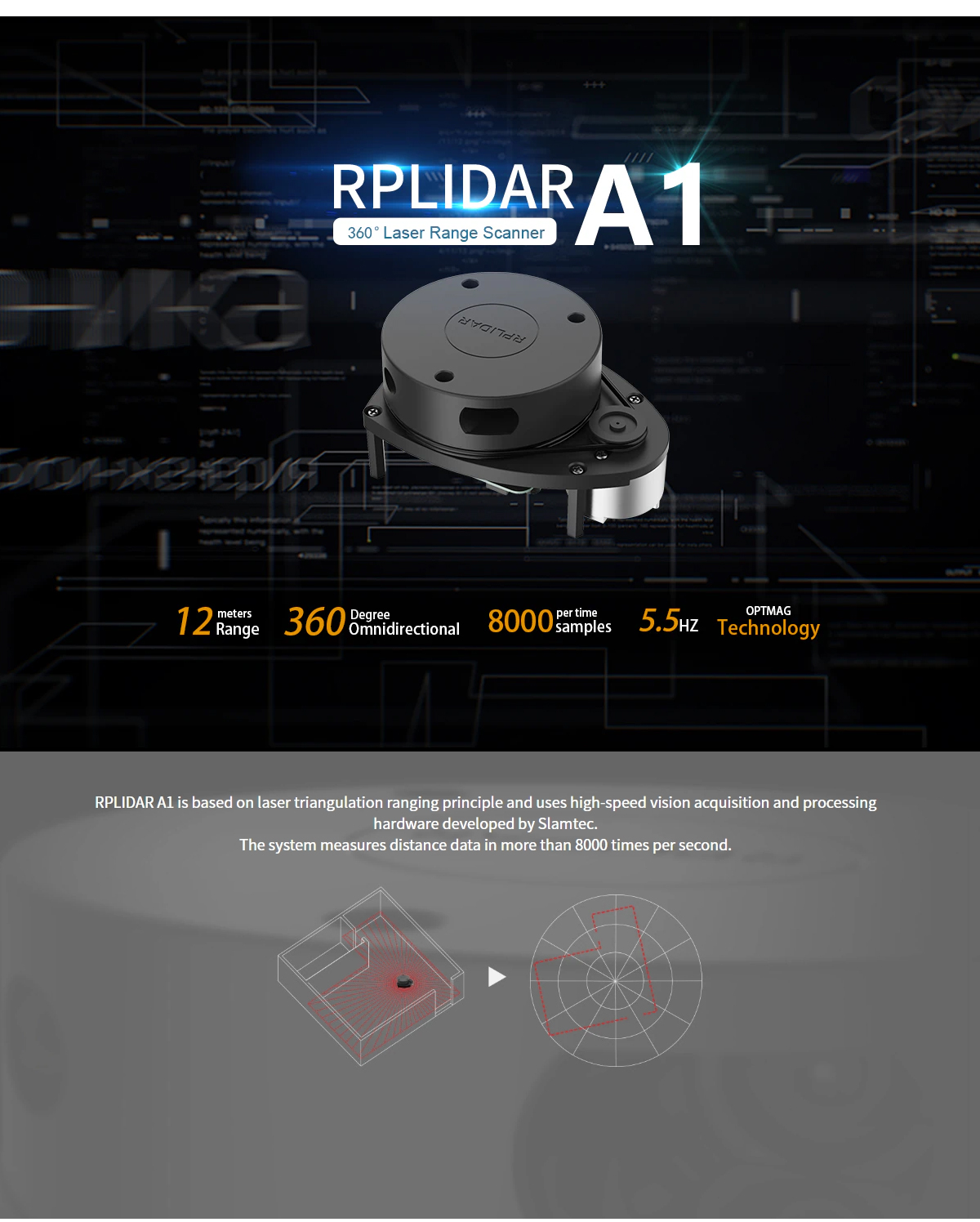RPLIDAR A1 is a low cost 360-degree 2D laser scanner (LIDAR) solution developed by SLAMTEC. The system can perform a 360degree scan within a 6meter range. The produced 2D point cloud data can be used in mapping, localization, and object/environment modeling.