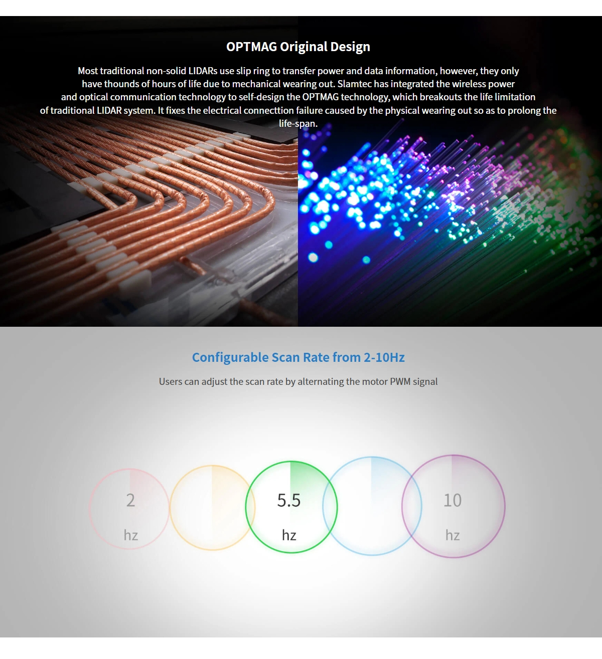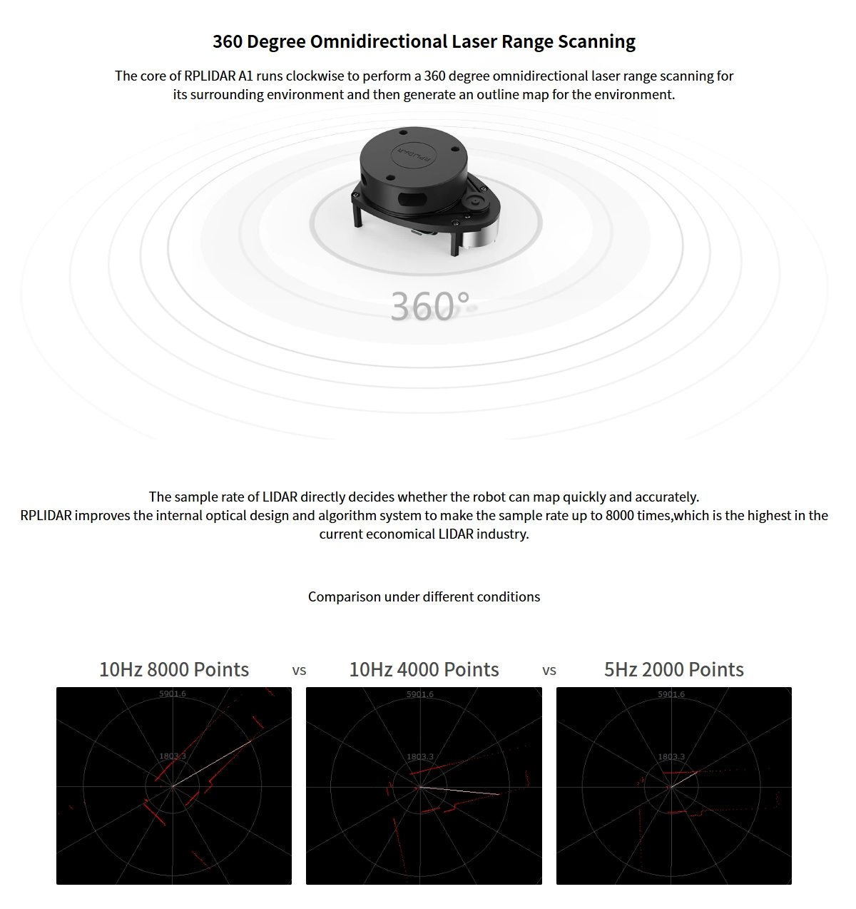 RPLIDAR A1’s scanning frequency reached 5.5 Hz when sampling 360 points each round. And it can be configured up to 10 Hz maximum.