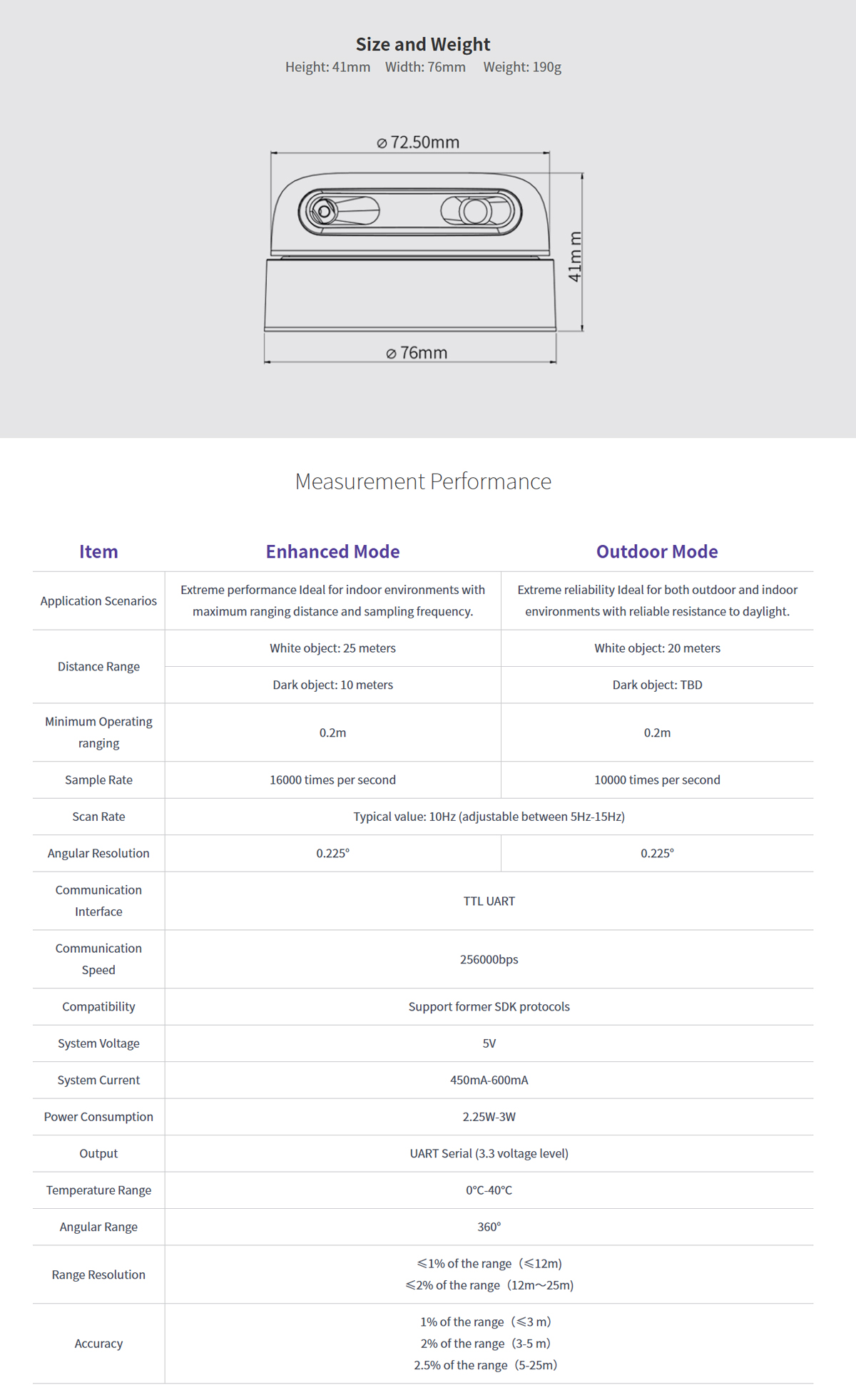 Enhanced Mode: Extreme performance, ideal for indoor environments with maximum ranging distance and sampling frequency