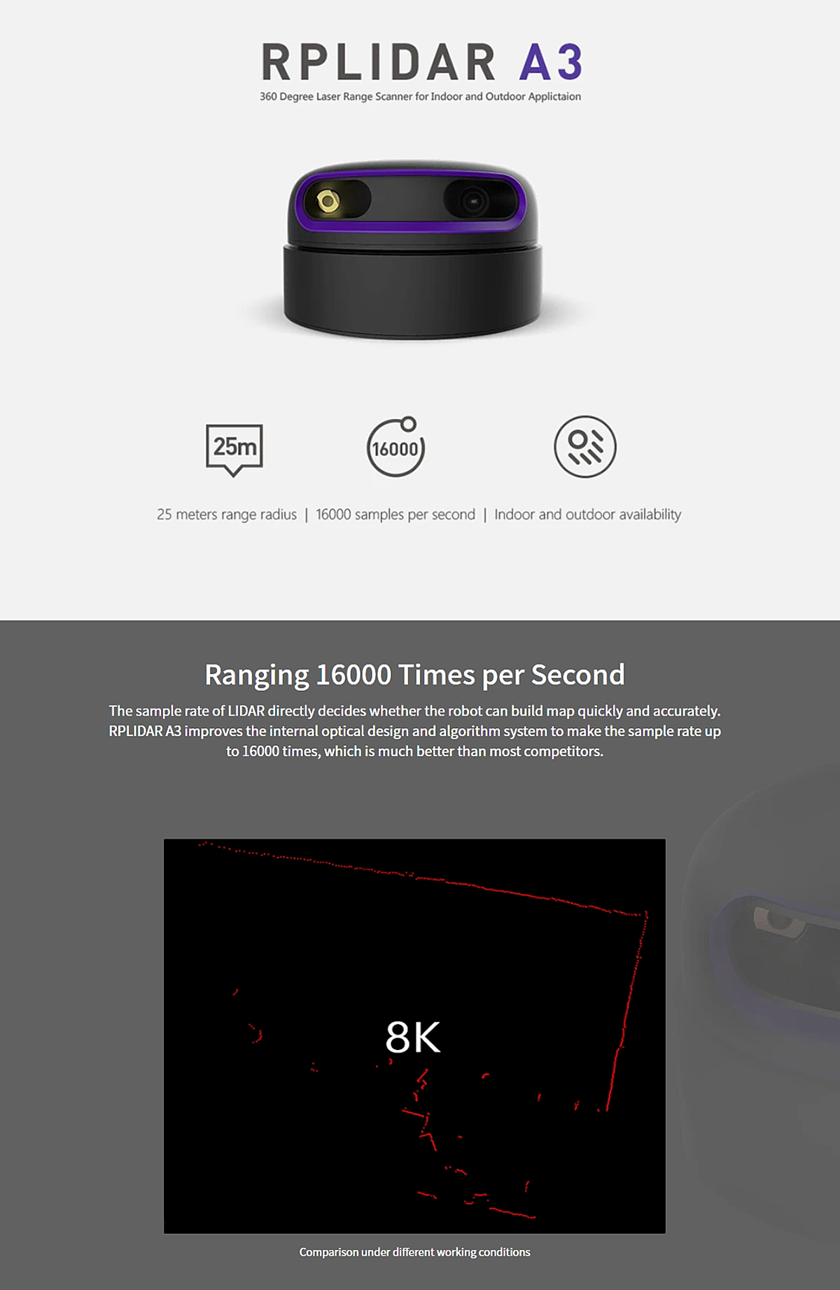 RPLIDAR A3 improves the internal optical design and algorithm system to make the sample rate up to 16000 times, which is much better than most competitors.