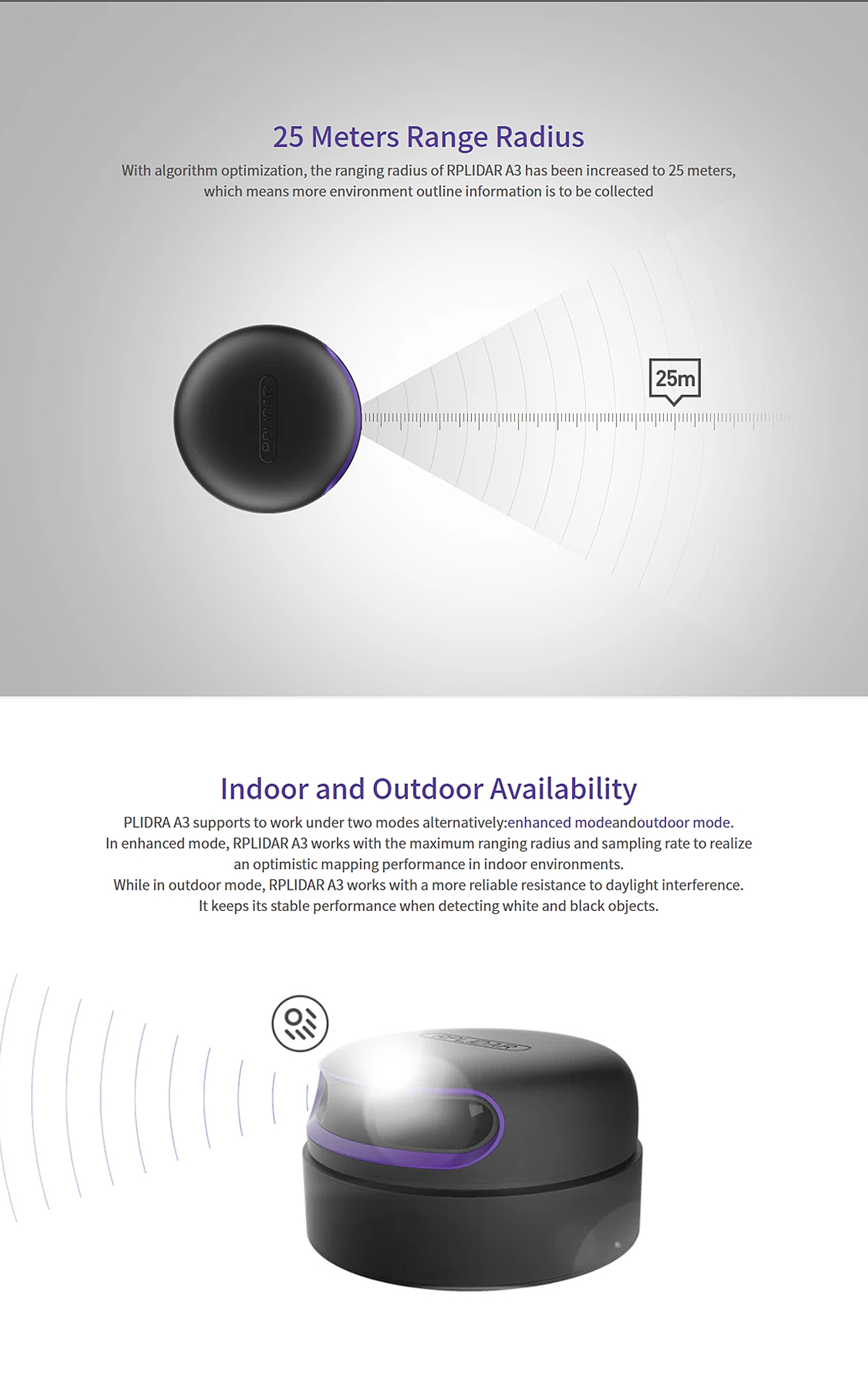 With algorithm optimization, the ranging radius of RPLIDAR A3 has been increased to 25 meters,
