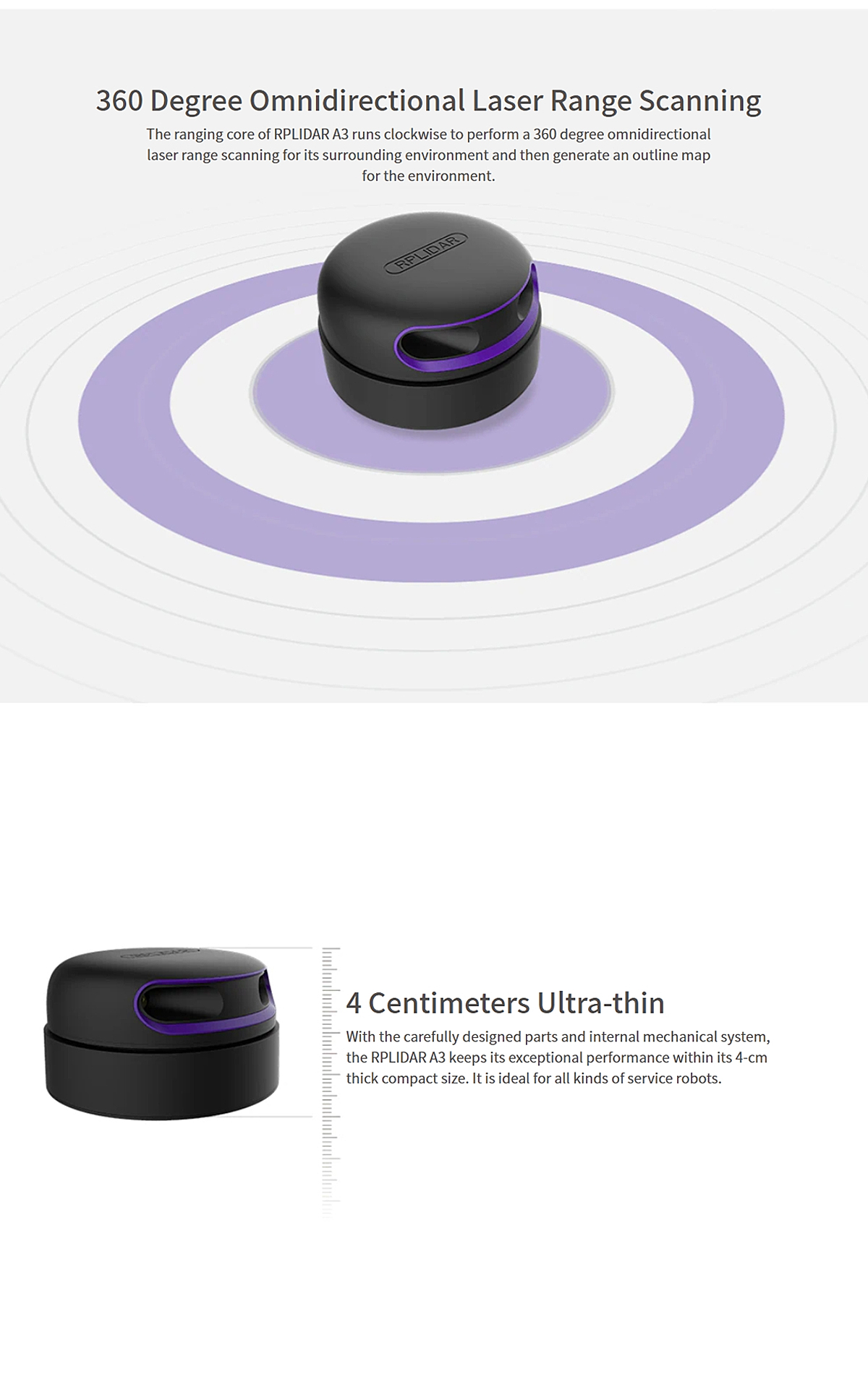 With the carefully designed parts and internal mechanical system, the RPLIDAR A3 keeps its exceptional performance within its 4-cm thick compact size. It is ideal for all kinds of service robots.