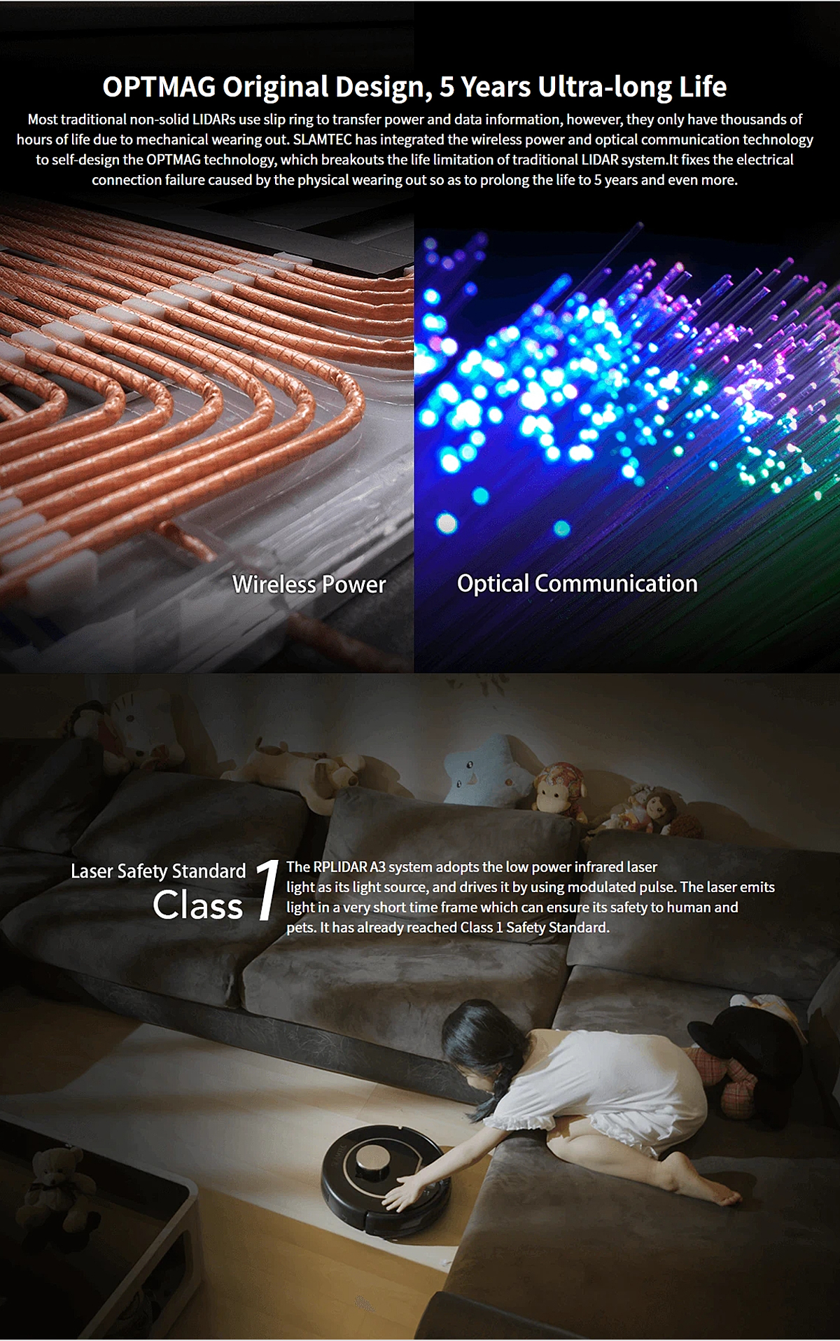 Most traditional non-solid LIDARs use slip ring to transfer power and data information, however, they only have thousands of hours of life due tomechanical wearing out. SLAMTEC has integrated the wireless power and optical communication technology to self-design the OPTMAG technology, which breakouts the life limitation of traditional LIDAR system. It fixes the electrical connection failure caused by the physical wearing out so as to prolong the life to 5 years and even more.