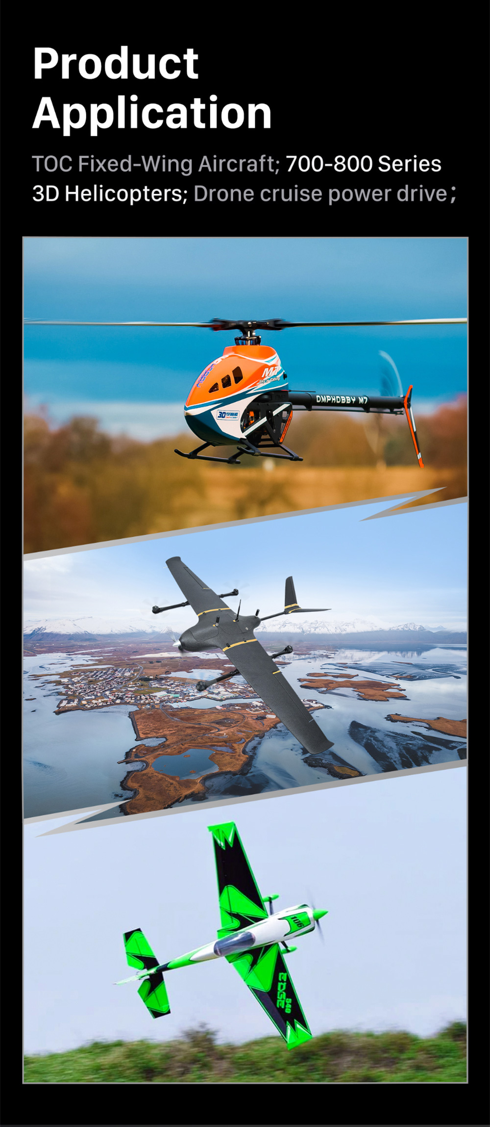 Compatible Aircraft Models: 1. 700-800 Class Heli (Main Blade:690-800mm 3D); 2. 60-120cc, Class Fixed-wing Airplane 3D