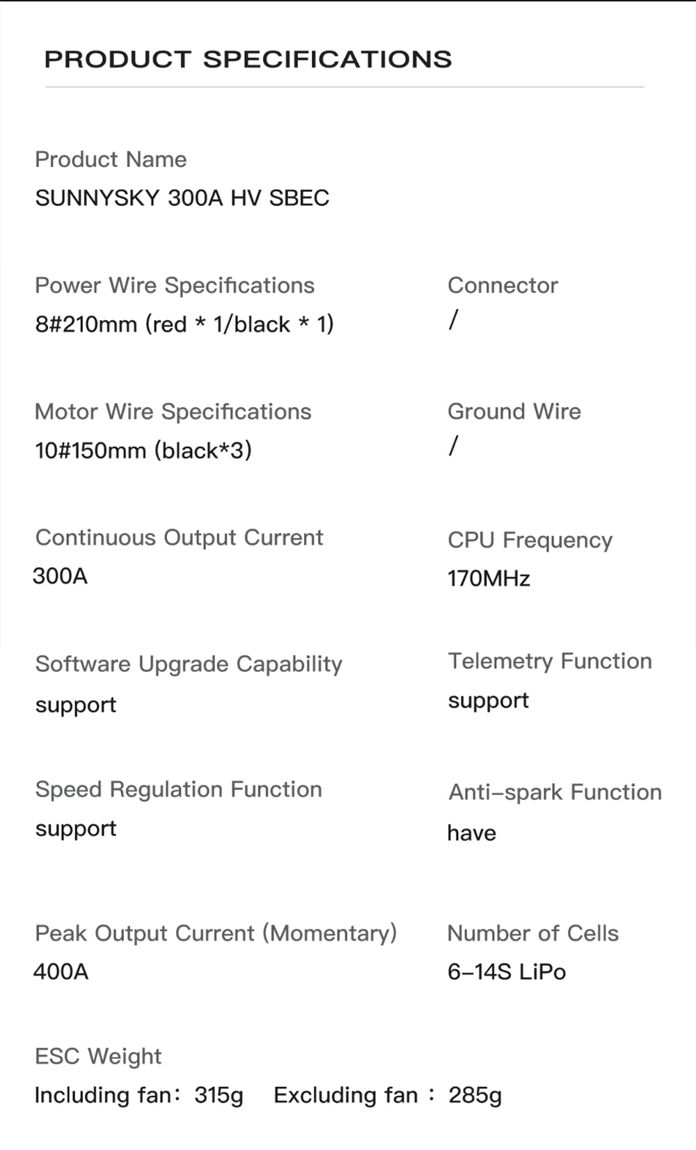 ESC Weight: Including fan: 315g; Excluding fan: 285g