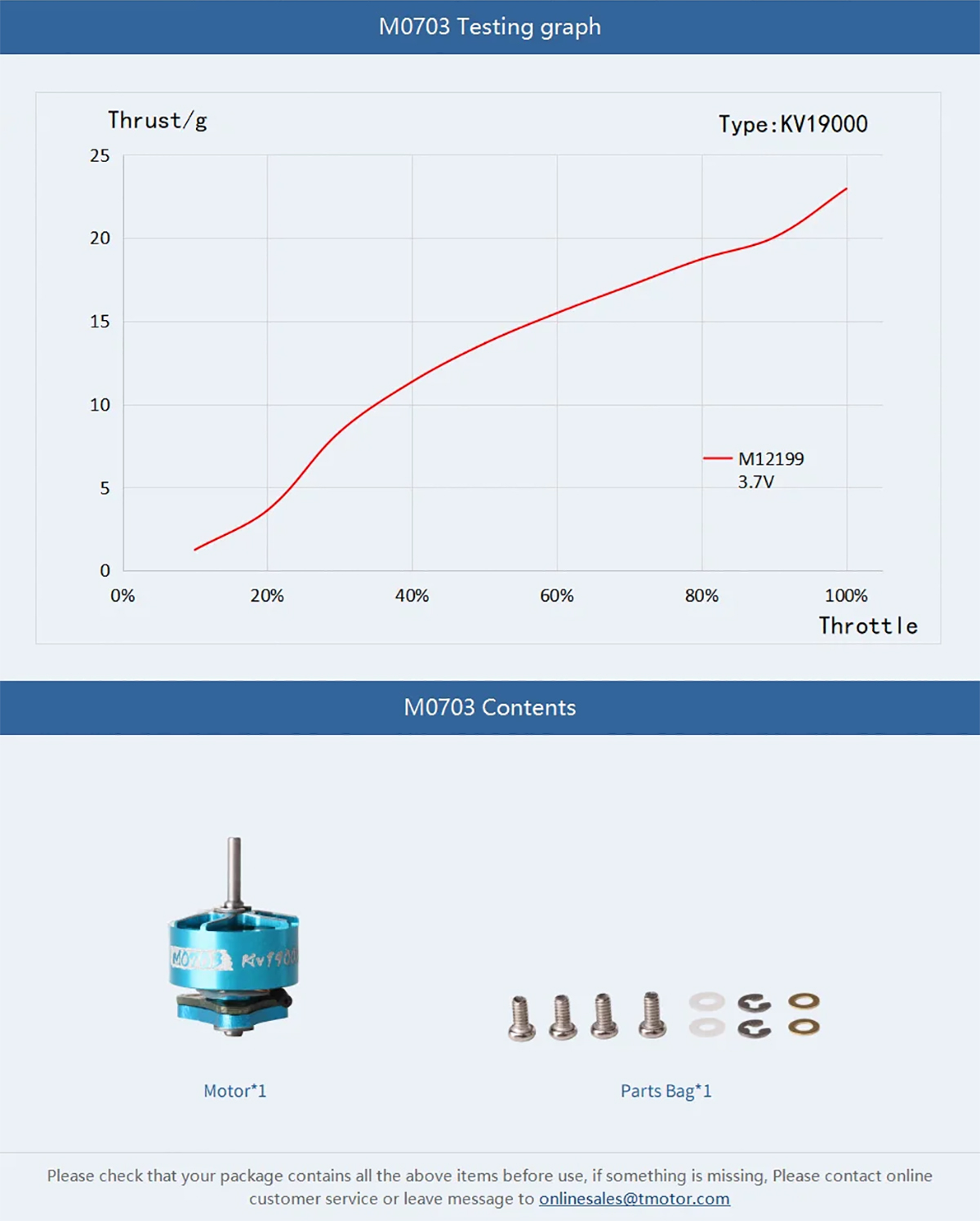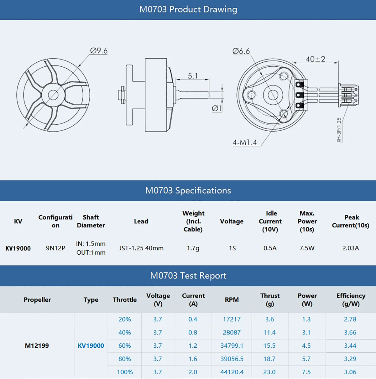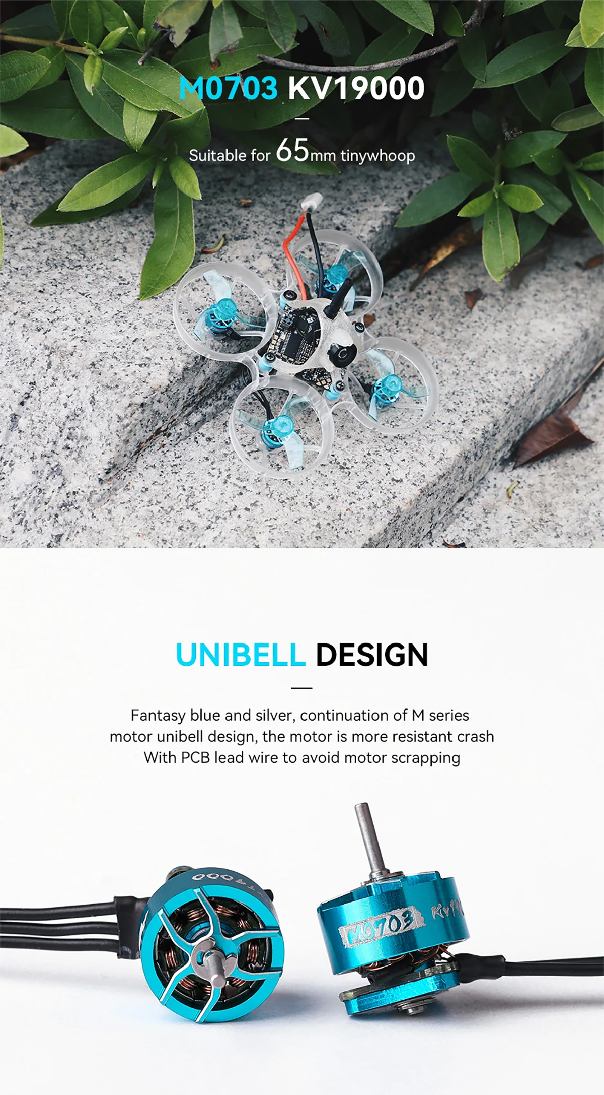 Boost your 65mm Whoop drone with the T-Motor M0703 19000KV brushless motor! Weighing just 1.7g and perfect for 1S setups, this durable motor offers crash resistance and top-tier performance. The sleek unibell design in blue and silver adds a stylish touch, making it ideal for racing and fast-paced flying. Enjoy smoother flights and push your drone to its limits with this high-quality, lightweight motor.