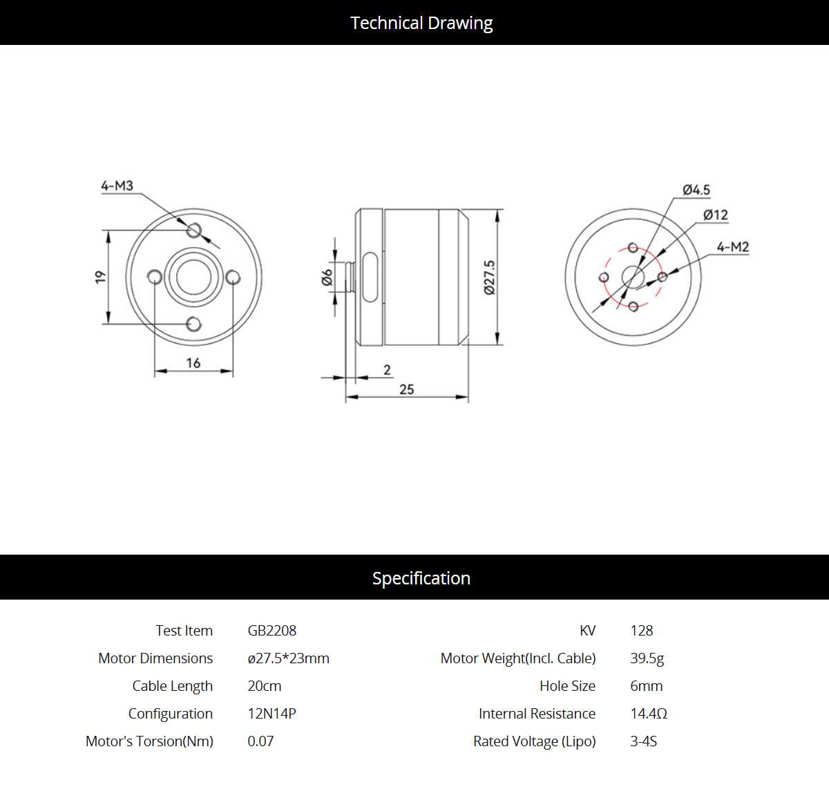 Rated Voltage (Lipo): 3-4S
