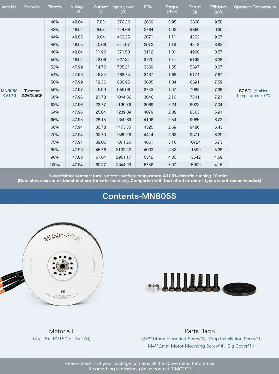 MN705-S T-MOTOR KV125 Brushless motor two piece set working rated voltage12S maximum power2200W
