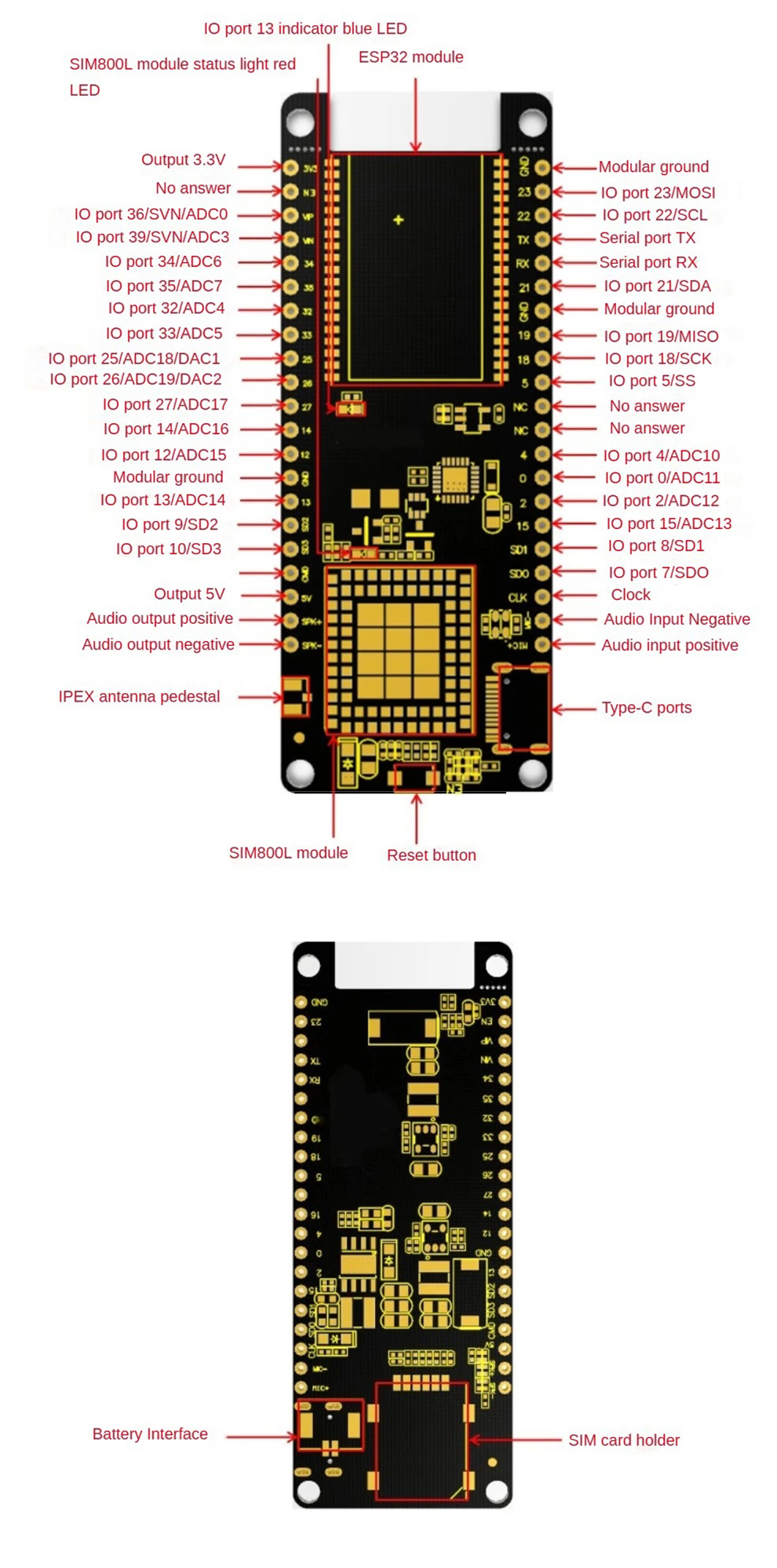 The main body of the module consists of ESP32-WROVER-B and SIM800L modules. The TYPE-C interface is extended from the periphery using the USB-to-serial port chip CP210X. It can be directly connected to a computer with a USB cable for debugging. The data transmission is fast and stable. The ESP32-WROVER-B is a universal WI-FI+BT+BLE MCU module, integrating the ESP32-D0WD chip, PCB on-board antenna. SIM800L is a 4-band GSM/GPRS module with operating frequencies of 850/900/1800/1900MHZ, capable of transmitting low-power voice, SMS and data information. The most prominent feature of this module is that it integrates the ESP32-WROVER-B and SIM800L modules, combines the functions of the two modules, and is equipped with a lithium battery charging and discharging circuit. It can supply power to the battery and charge the battery, and has overcharge and overdischarge protection.
