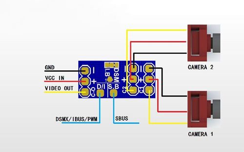VIFLY Cam Switcher is a smart accessory to take the signal from PWM receiver and SBUS/IBUS/DSMX receiver. Now you can easily switch the two cameras on racing drone or RC plane.