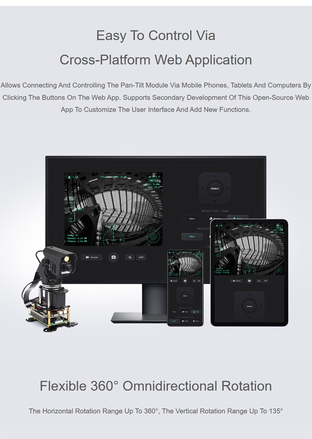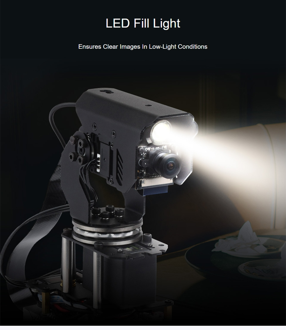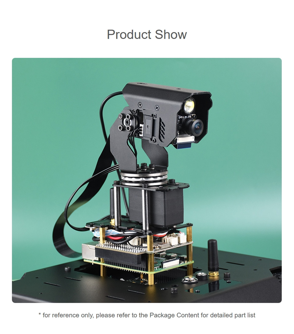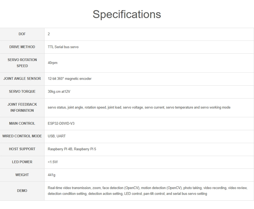 Demo: Real-time video transmission, zoom, face detection (OpenCV), motion detection (OpenCV), photo taking, video recording, video review, detection condition setting, detection action setting, LED control, pan-tilt control, and serial bus servo setting