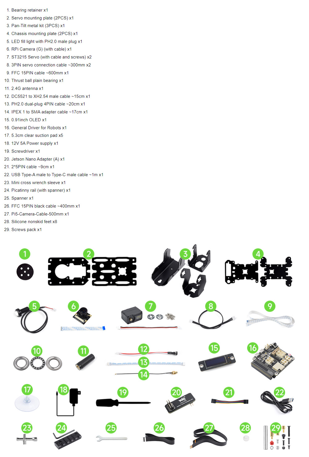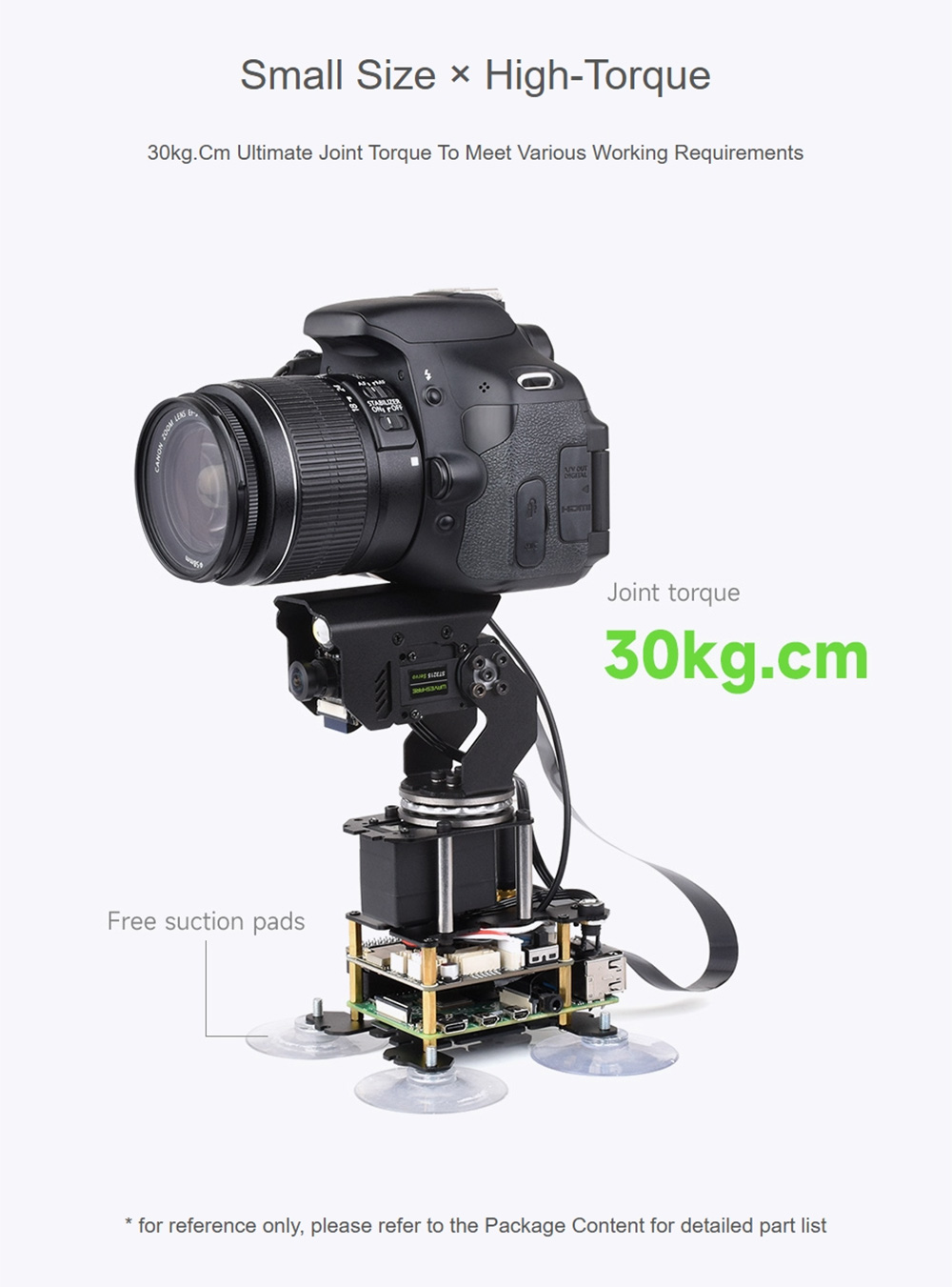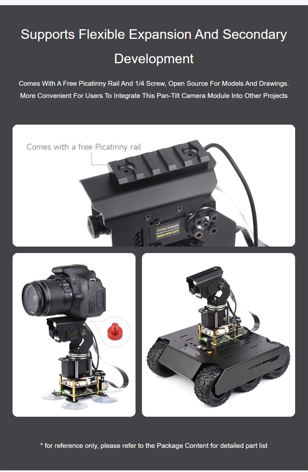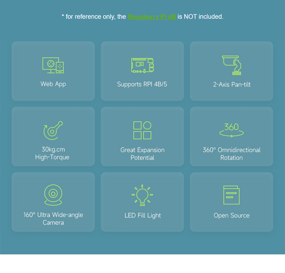 Demo: Real-time video transmission, zoom, face detection (OpenCV), motion detection (OpenCV), photo taking, video recording, video review, detection condition setting, detection action setting, LED control, pan-tilt control, and serial bus servo setting