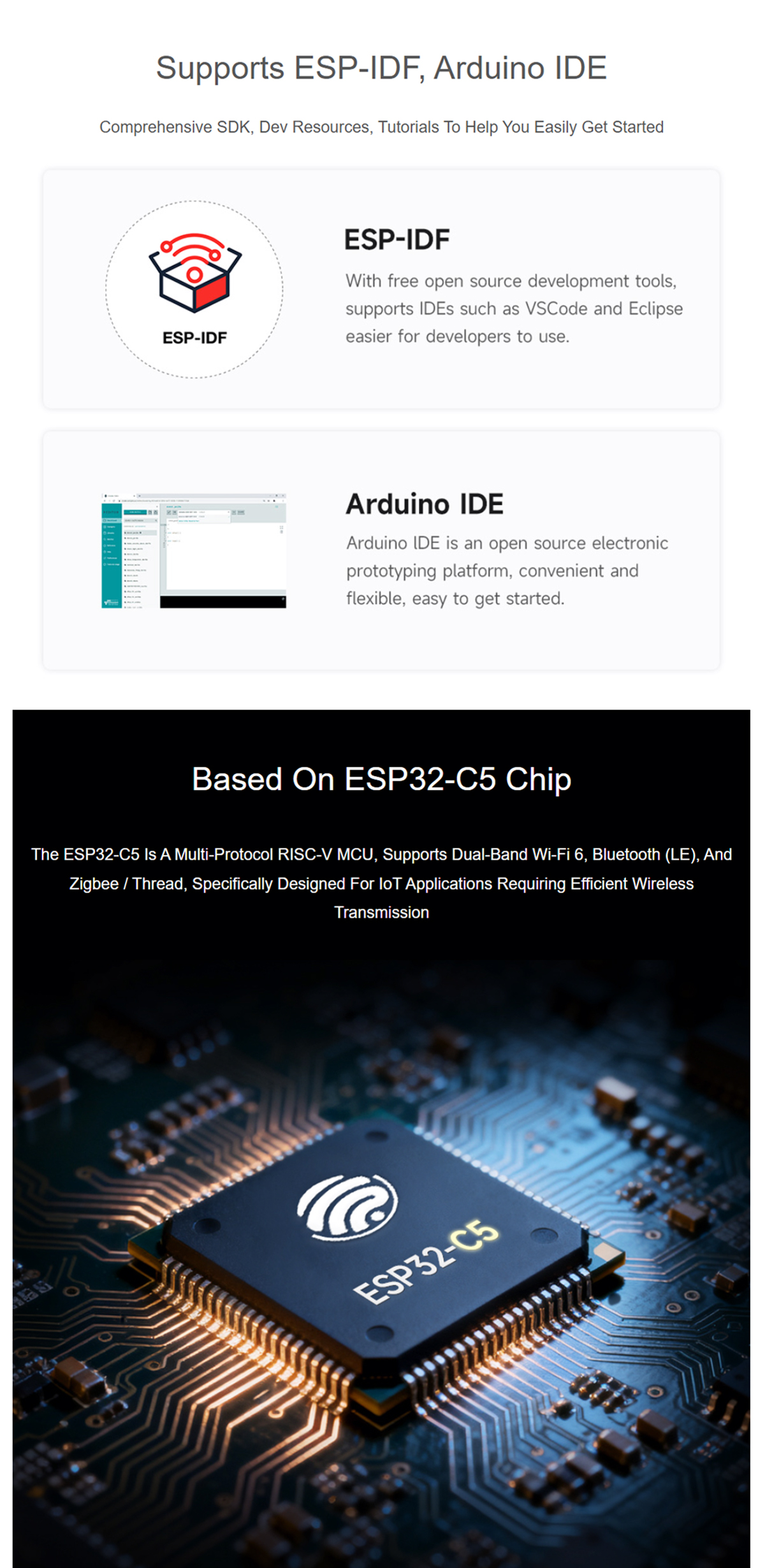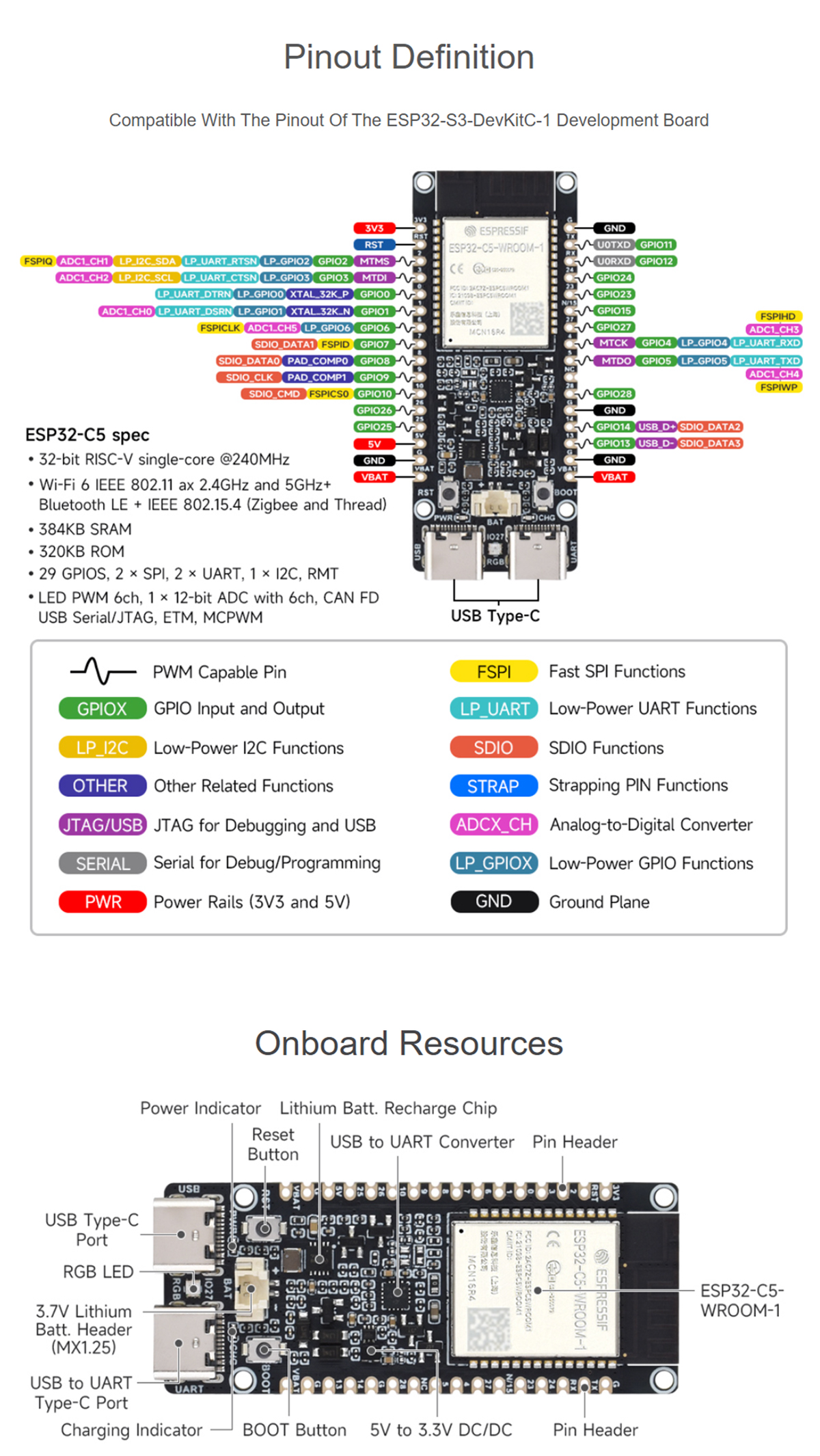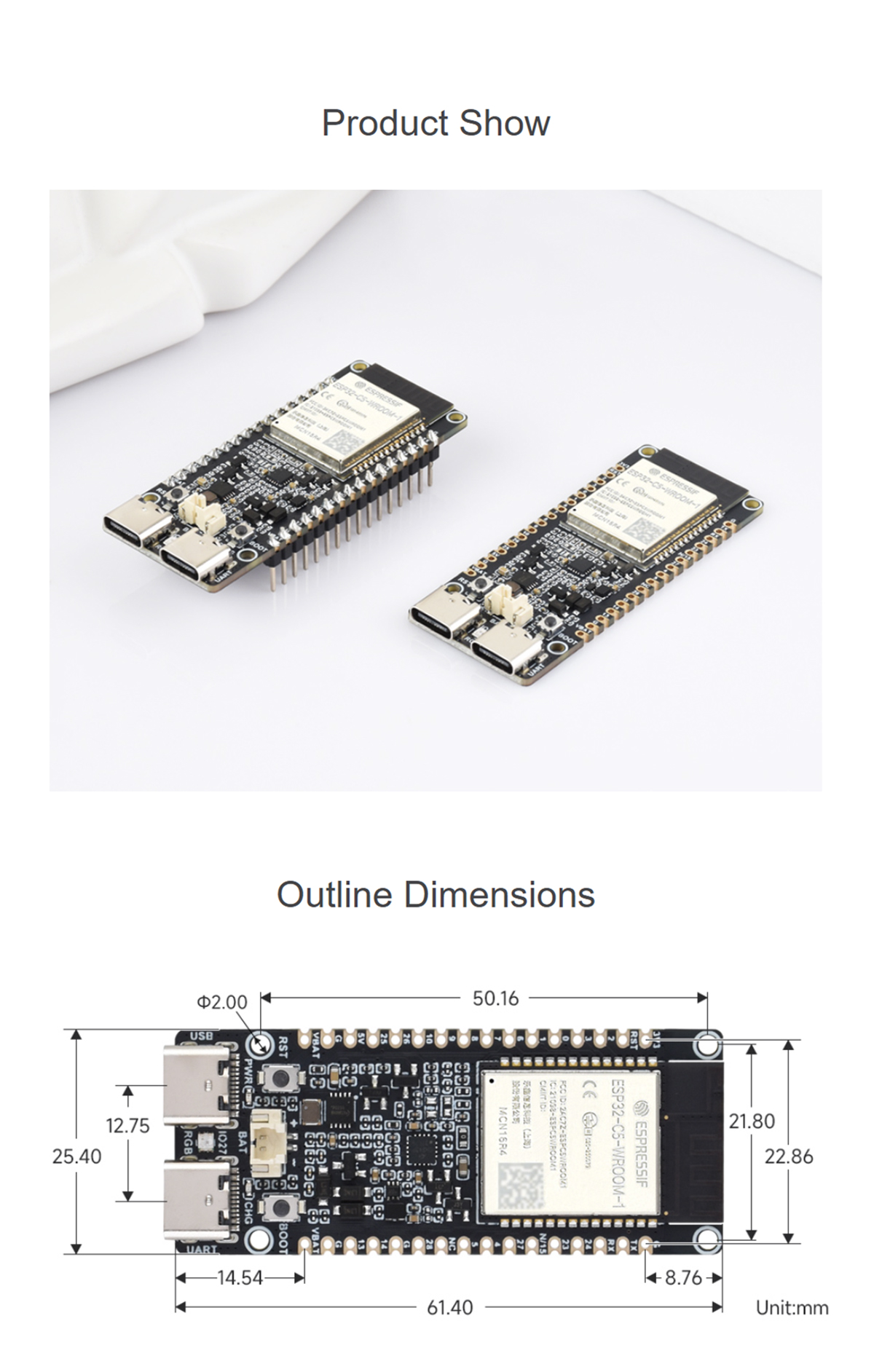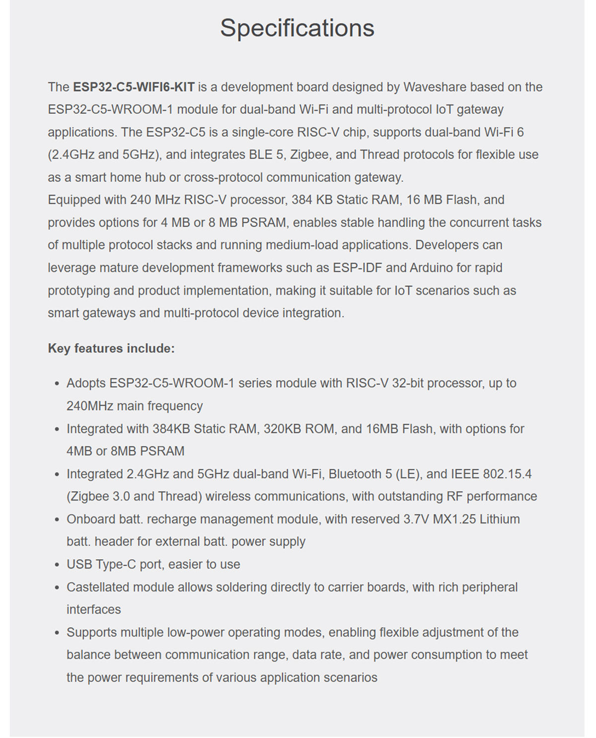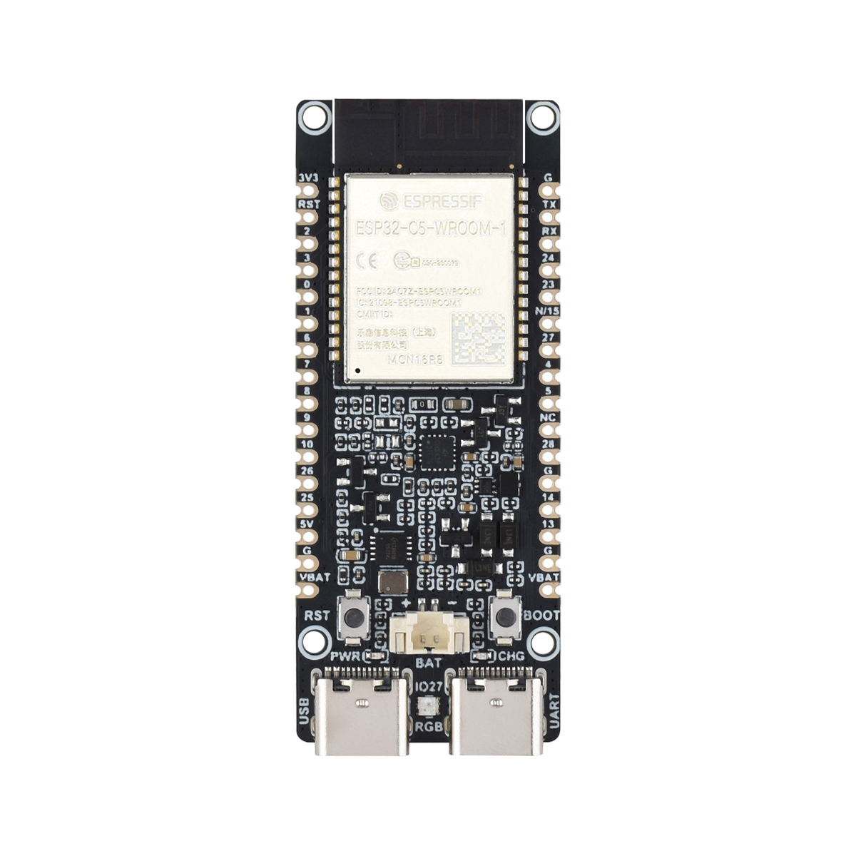 Adopts ESP32-C5-WROOM-1 series module with RISC-V 32-bit processor, up to 240MHz main frequency
