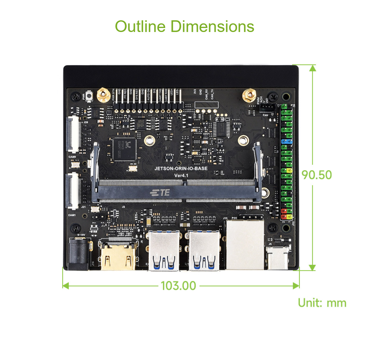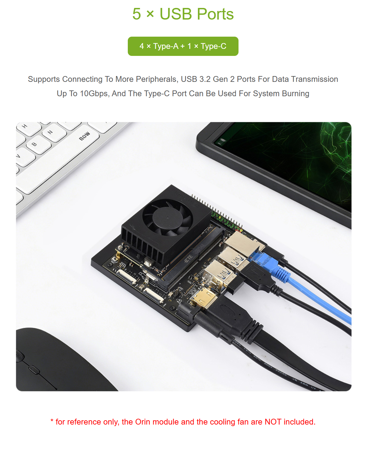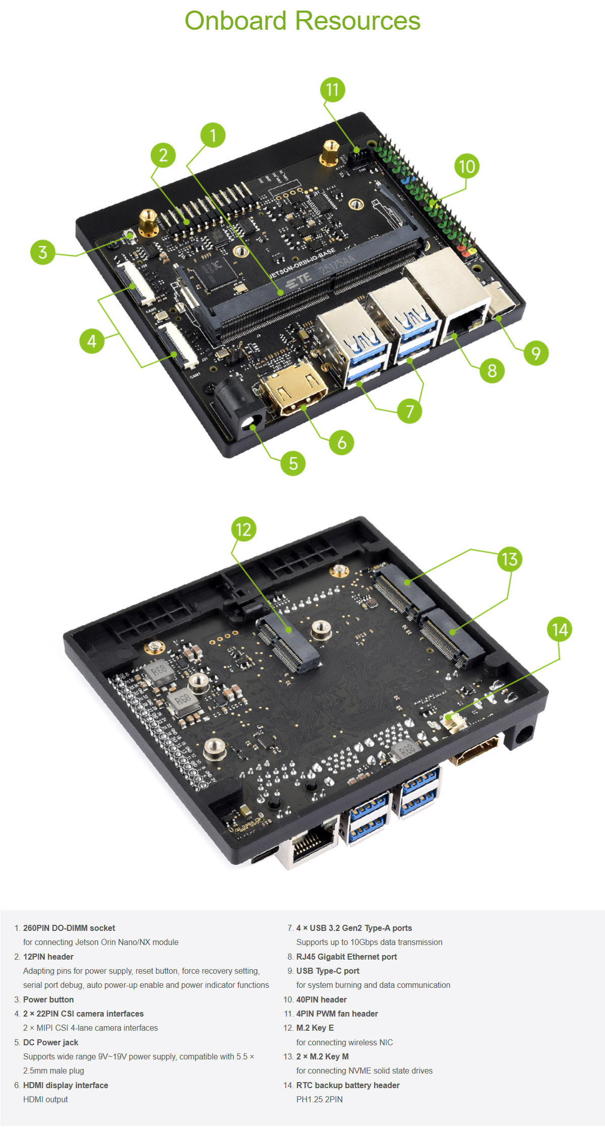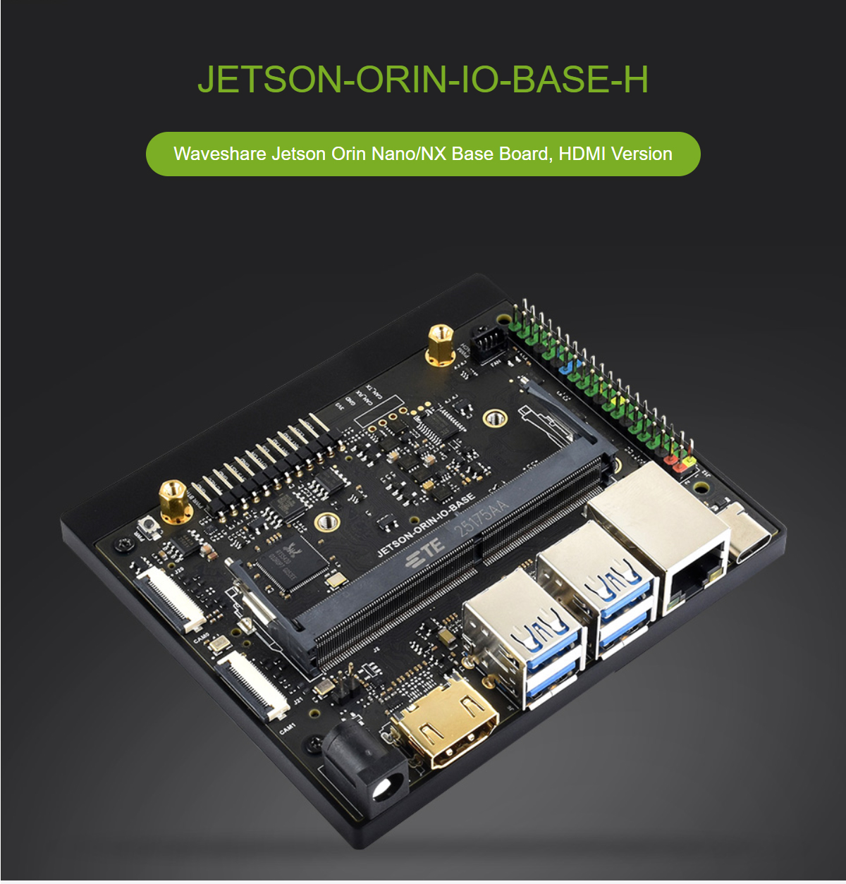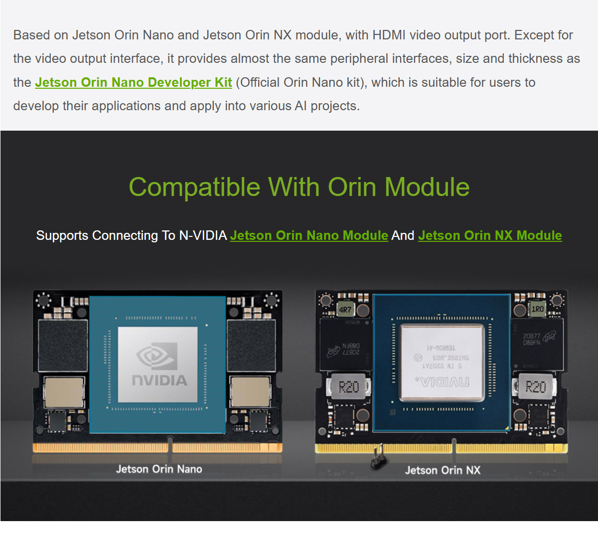 Based on Jetson Orin Nano and Jetson Orin NX module, with HDMI video output port. Except for the video output interface, it provides almost the same peripheral interfaces, size and thickness as the Jetson Orin Nano Developer Kit (Official Orin Nano kit), which is suitable for users to develop their applications and apply into various AI projects.