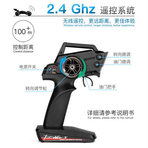 【2.4GHz Anti-interference remote control】 2.4 GHz radio system with anti-jamming function allows you to run simultaneously in the same track. Control distance of 100 meters, free running.