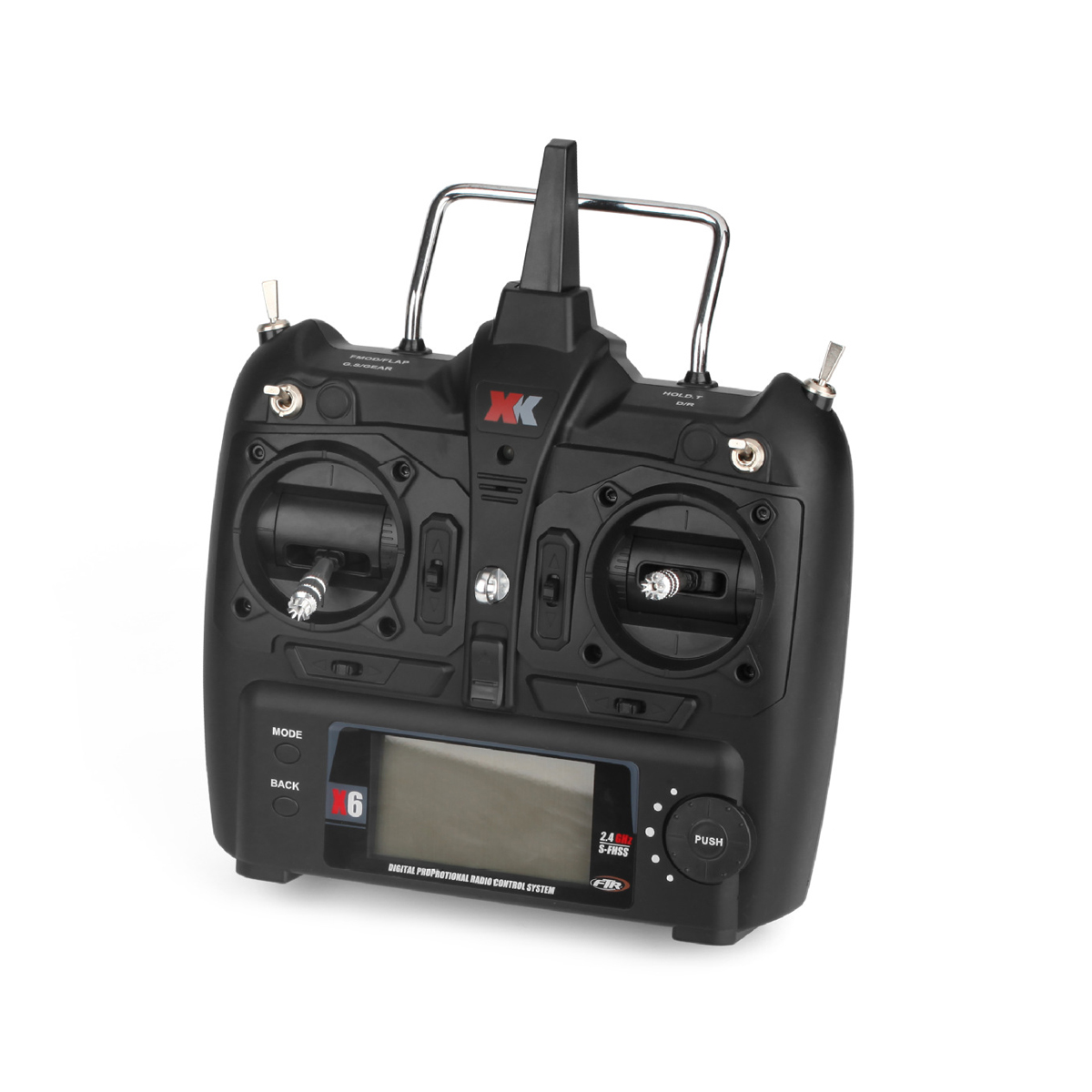 6-channel remote controller with functions including 3D aerobatic IDLE switch, throttle hold (TH.HOLD) switch, large LCD screen display, and low-voltage alarm. It also features a dedicated hover trim adjustment function; enter the setting mode to calibrate the hover position according to personal preferences.