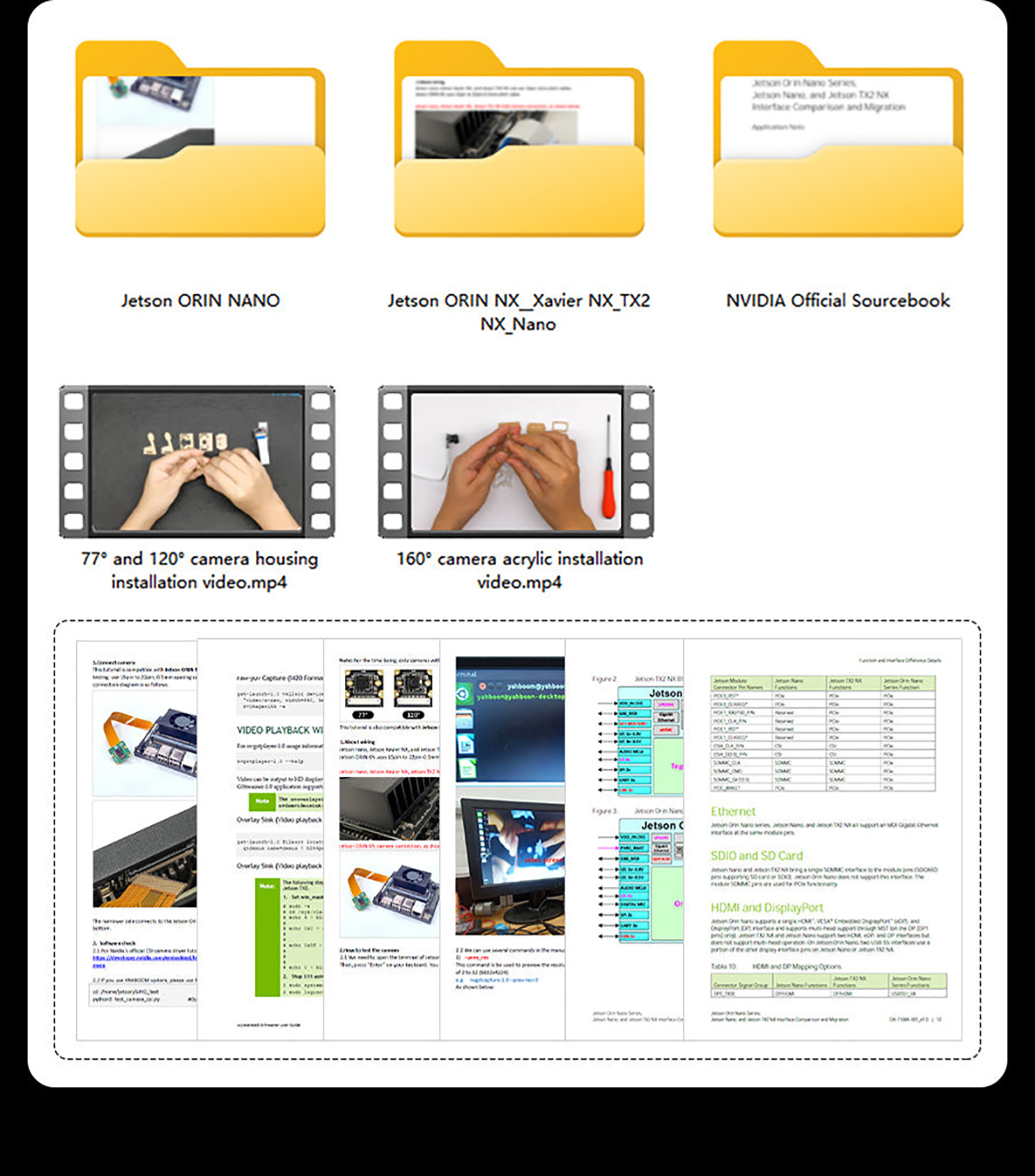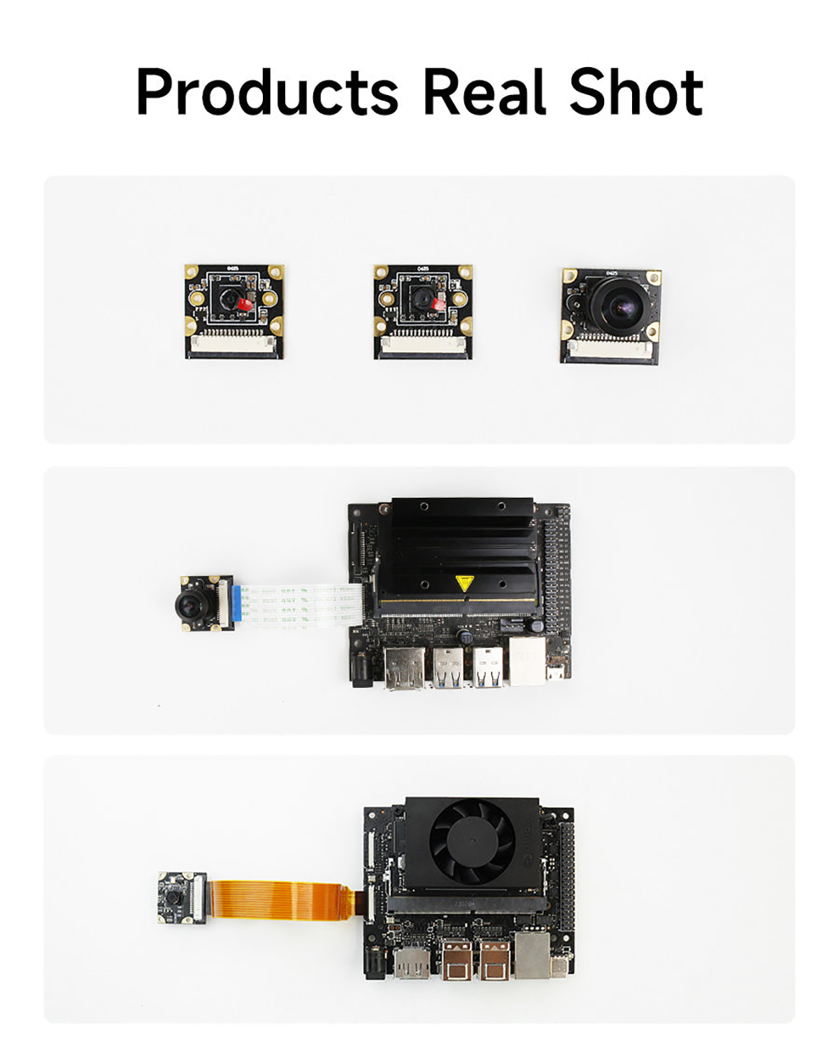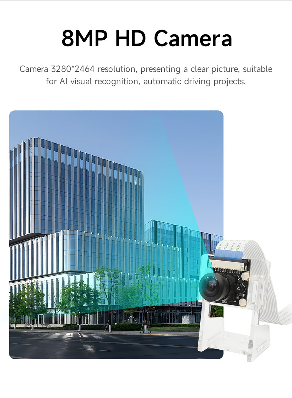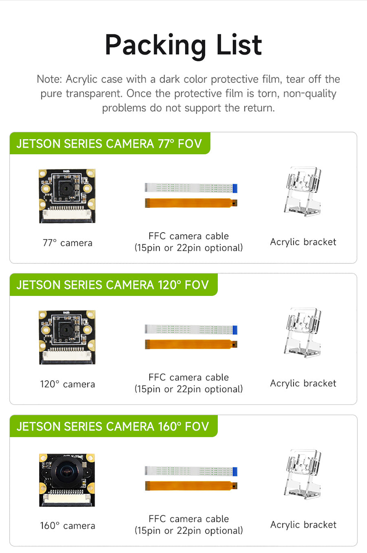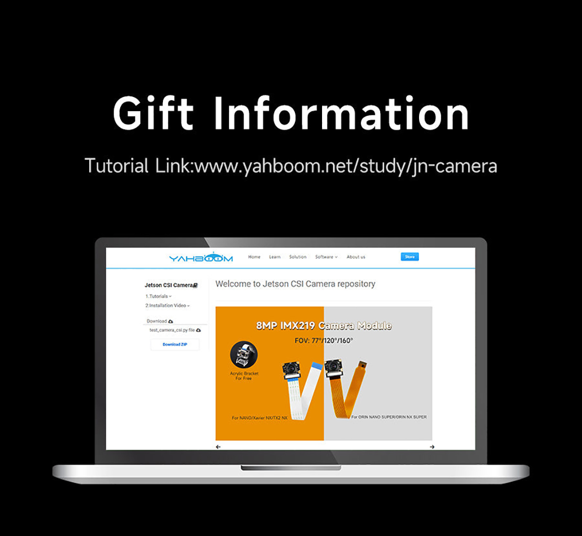 This camera is suitable for Jetson Nano/Xavier NX/TX2 NX/Orin NX SUPER/Orin NANO SUPER. It adopts IMX219 chip and CSI interface. The pixel is 800W, resolution is 1080P, and the field of view angle is 77°, 120° and 160°. It can be used to neural network, AI vision, real-time image recognition, AI smart robot cars and other fields. We will provide a transparent acrylic bracket for the camera, which can be mounted on the acrylic case.