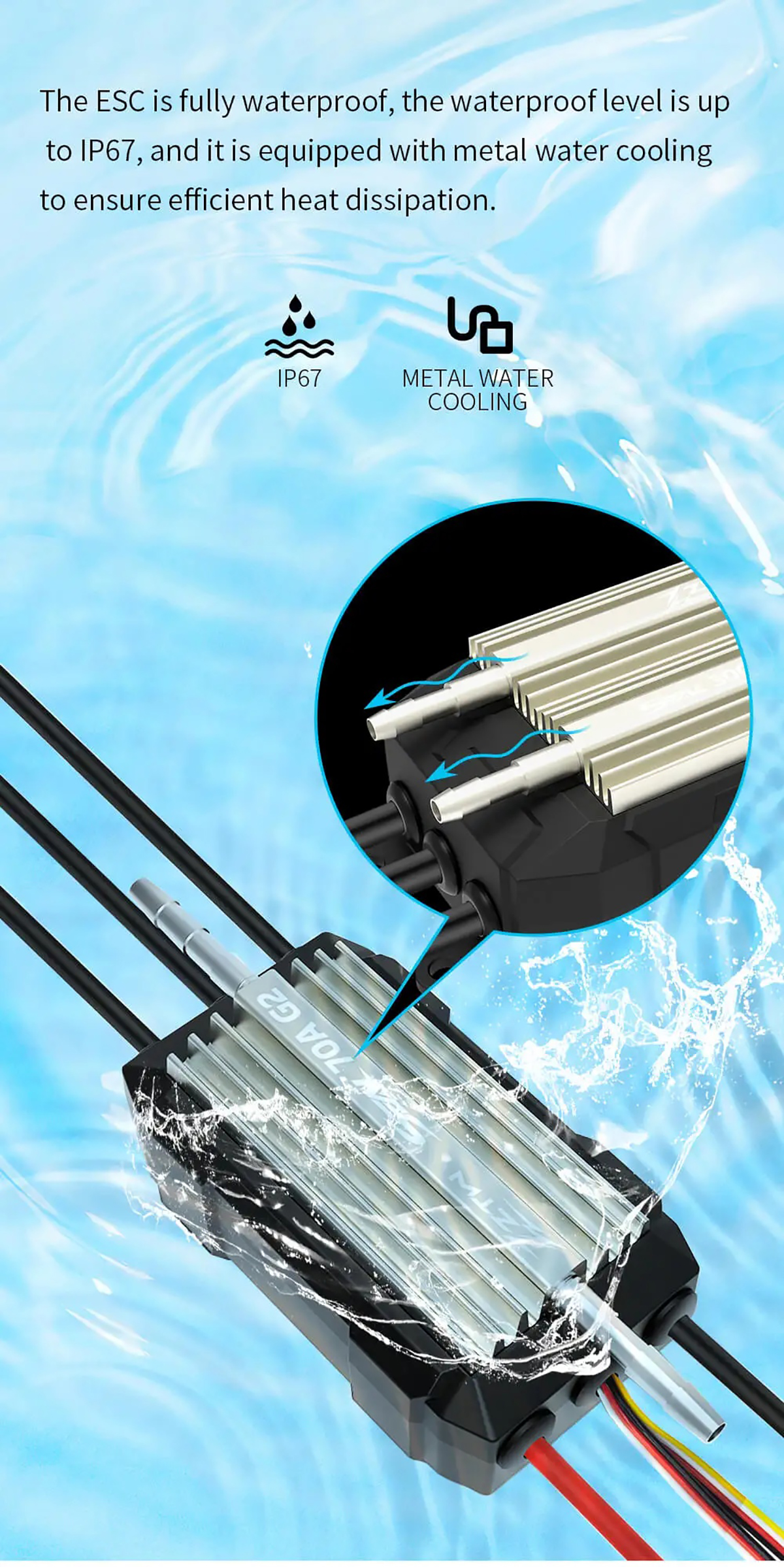 The waterproof design (rates as IP 67) allows this ESC to work in wet conditions, and it is equipped with metal water cooling to ensure efficient heat dissipation.