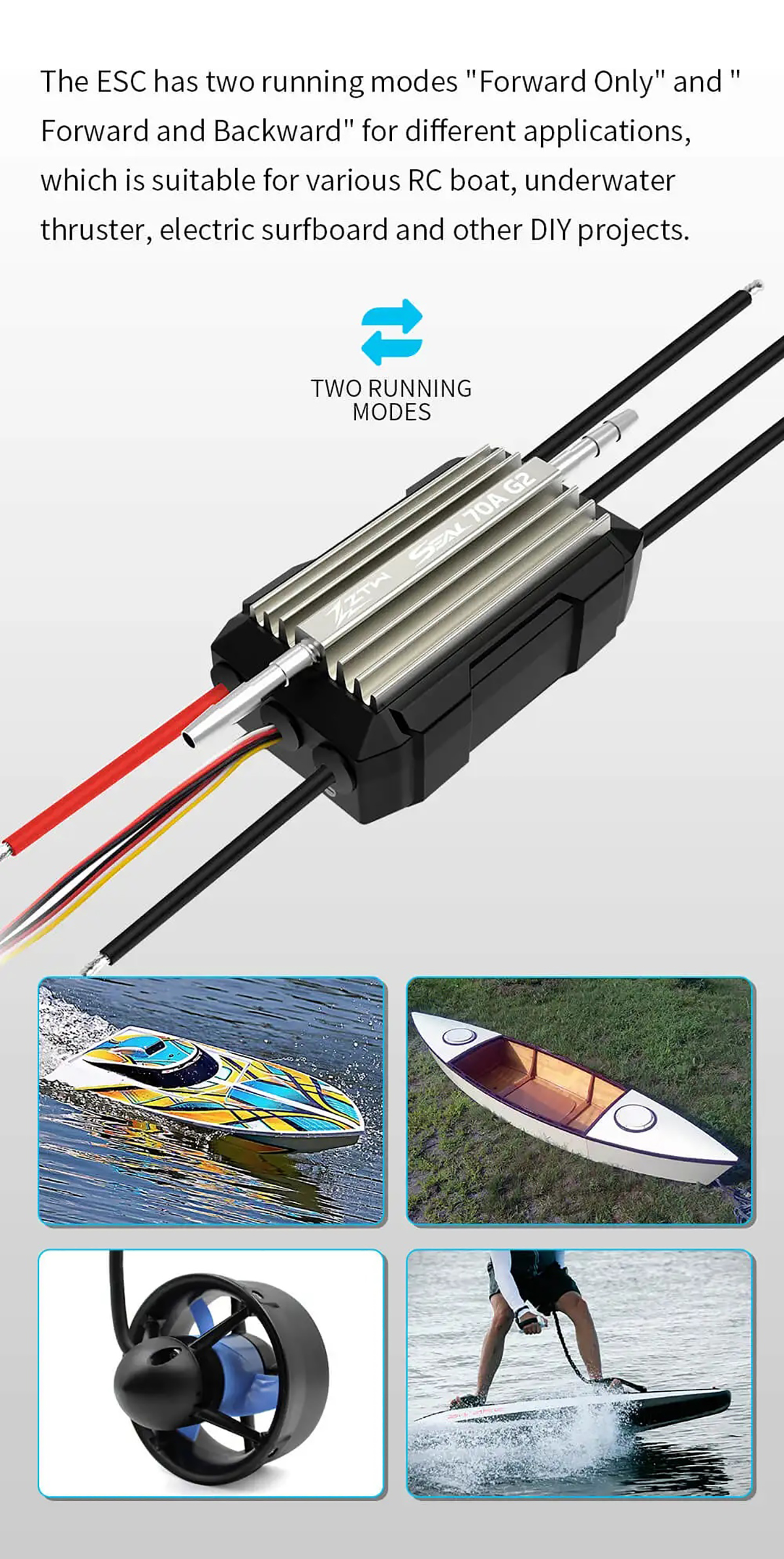 Super smooth start-up and accurate throttle linearity make the ESC suitable for various of applications such as, all kinds of RC boat models, electric surfboard and other underwater applications.