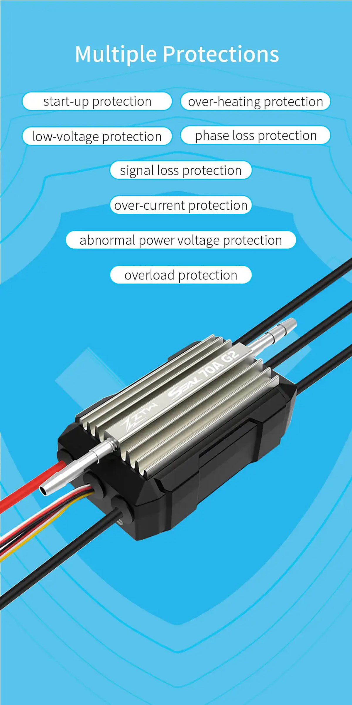 Adopting high performance 32 bit microprocessor, the operation frenquency is up to 170MHz which makes the ESC stronger computing ability and faster running speed.