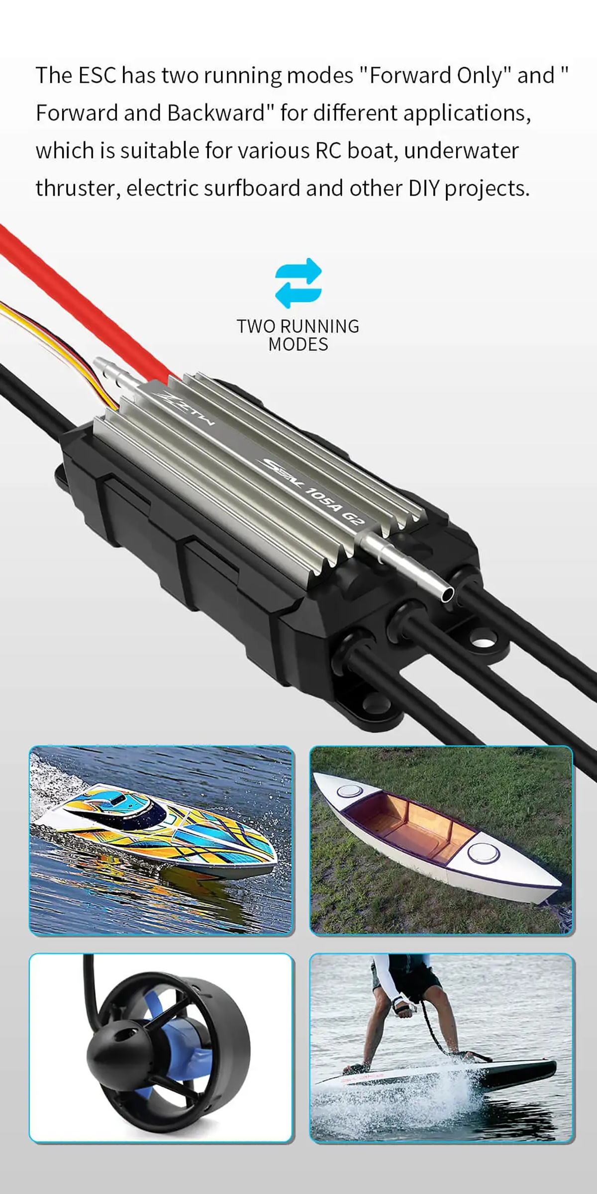 Super smooth start-up and accurate throttle linearity make the ESC suitable for various of applications such as, all kinds of RC boat models, electric surfboard and other underwater applications.