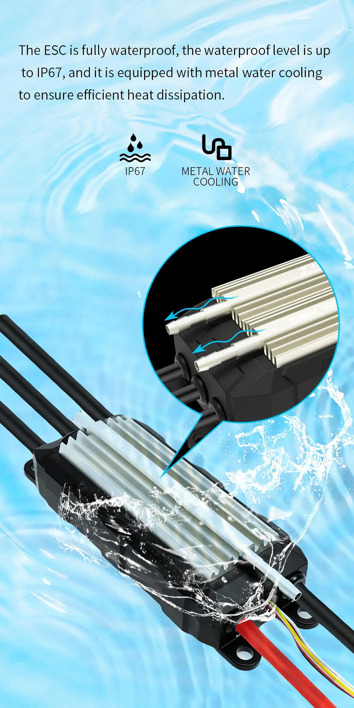 The waterproof design (rates as IP 67) allows this ESC to work in wet conditions, and it is equipped with metal water cooling to ensure efficient heat dissipation.